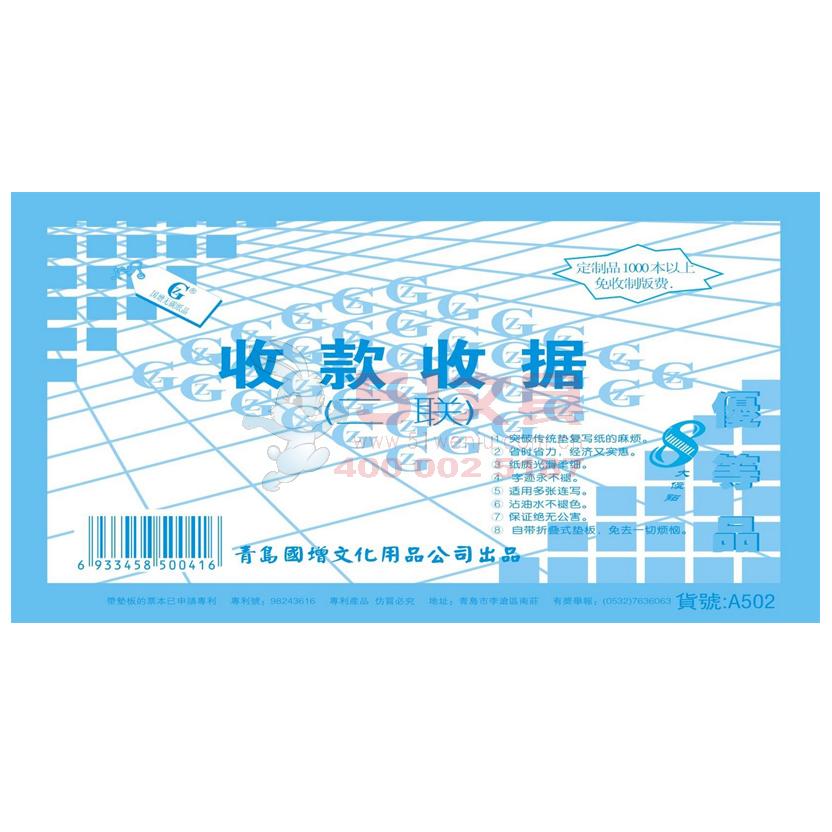 商品名称:国增A502,48K二联收款收据(1/20/360) 国增收据 48K单栏收据,无碳复写单据 商品编号:81.08.49.0502 品牌:国增/GZ 上架时间:2017-03-30 商品毛重:0克 如果您发现商品信息不准确,欢迎纠错;如果您发现有比51文具价格更低的,欢迎举报