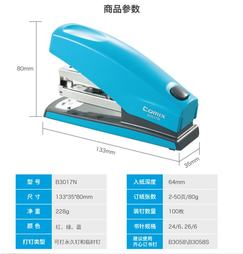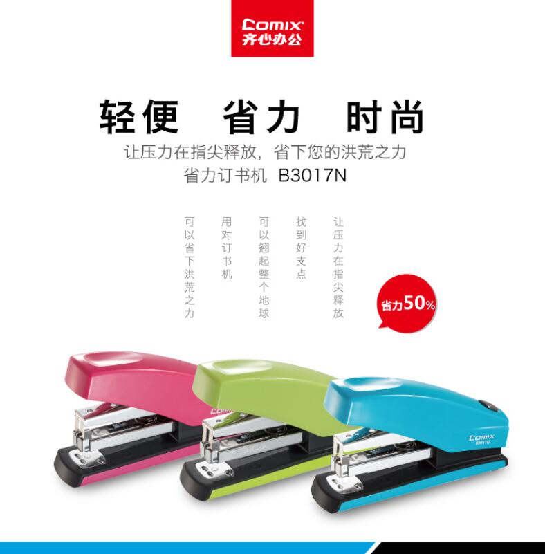 商品名称:齐心B3017N,12省力订书机(1/12/72)齐心省力订书机 12#订书机 商品编号:13.02.01.3017 品牌:齐心/COMIX 上架时间:2017-04-25 商品毛重:0克 如果您发现商品信息不准确,欢迎纠错;如果您发现有比51文具价格更低的,欢迎举报