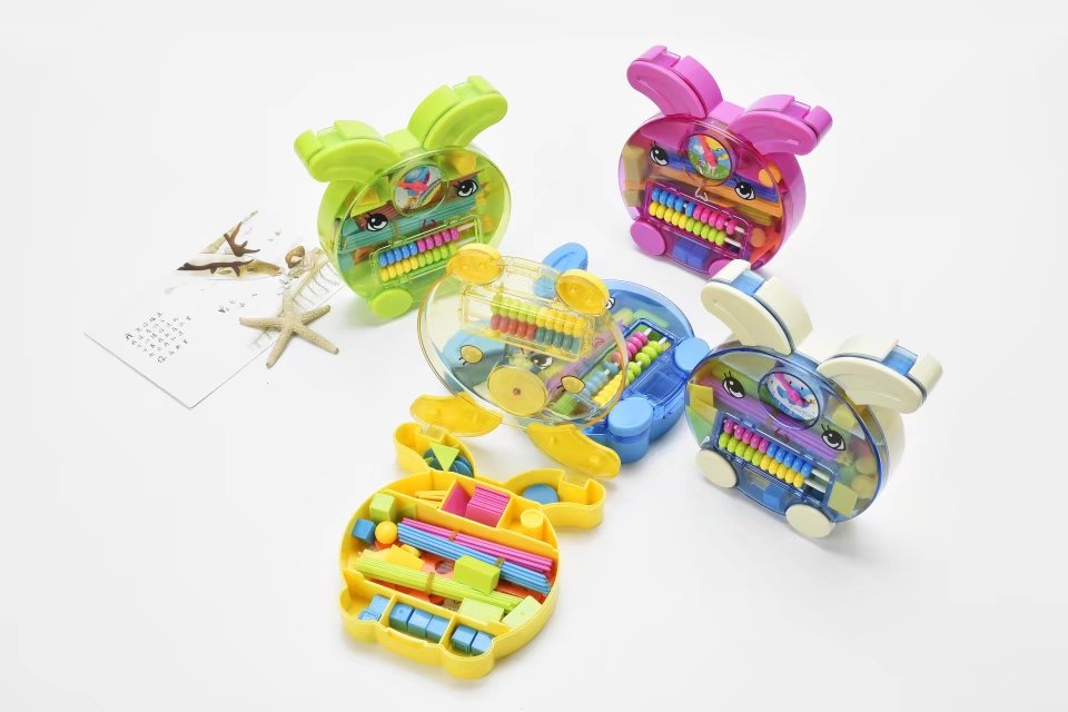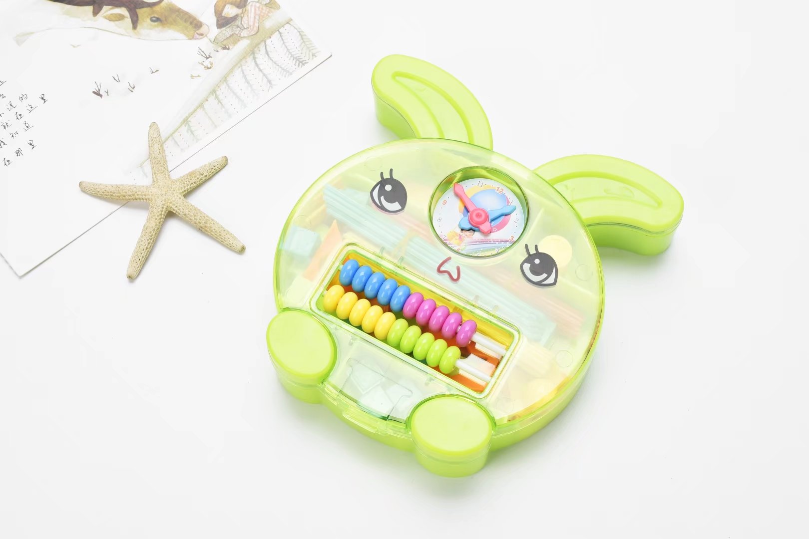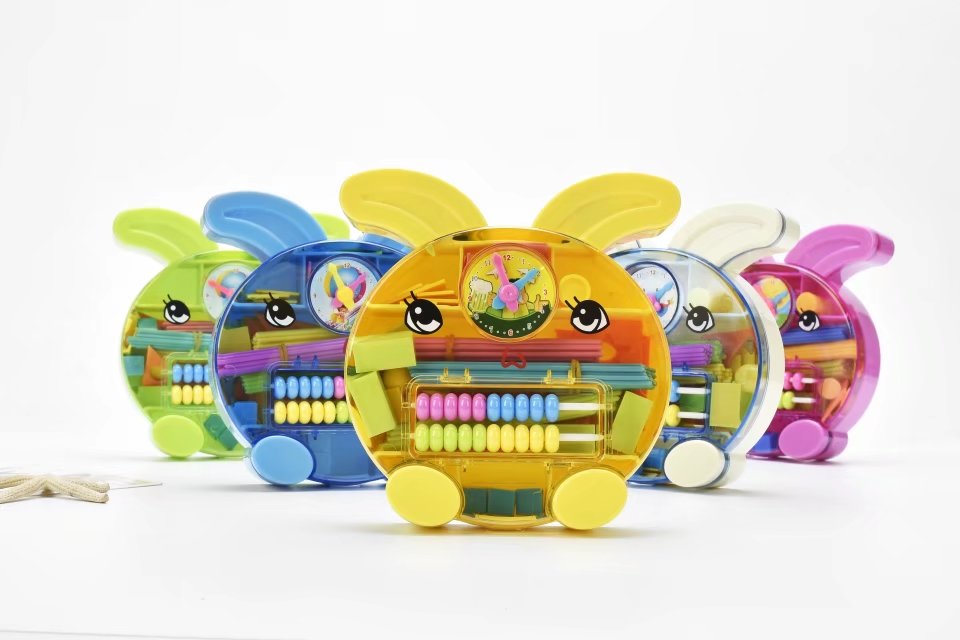 内含七巧板一套(七块)附说明书,圆锥体,球体,圆柱体,正方体,长方体,七彩计数棒100根,钟面学习器,教学用人民币一套