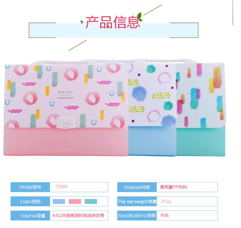 商品名称:得力72386,A4,13格卡通学生风琴包 商品编号:11.02.05.72386 品牌:得力/deli 上架时间:2017-05-16 商品毛重:0克 规格:A4 含量:1/12/48 起订量:中包 如果您发现商品信息不准确,欢迎纠错;如果您发现有比51文具价格更低的,欢迎举报