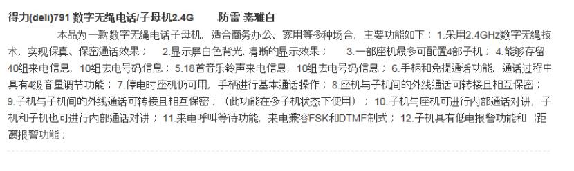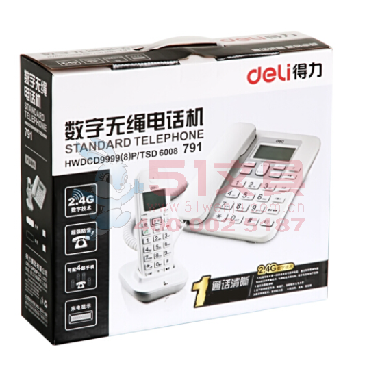 商品名称:得力791,数字无绳电话/子母机2.4G 防雷 商品编号:12.07.64.0791 品牌:文具/LZN 上架时间:2017-06-14 商品毛重:0克 如果您发现商品信息不准确,欢迎纠错;如果您发现有比51文具价格更低的,欢迎举报