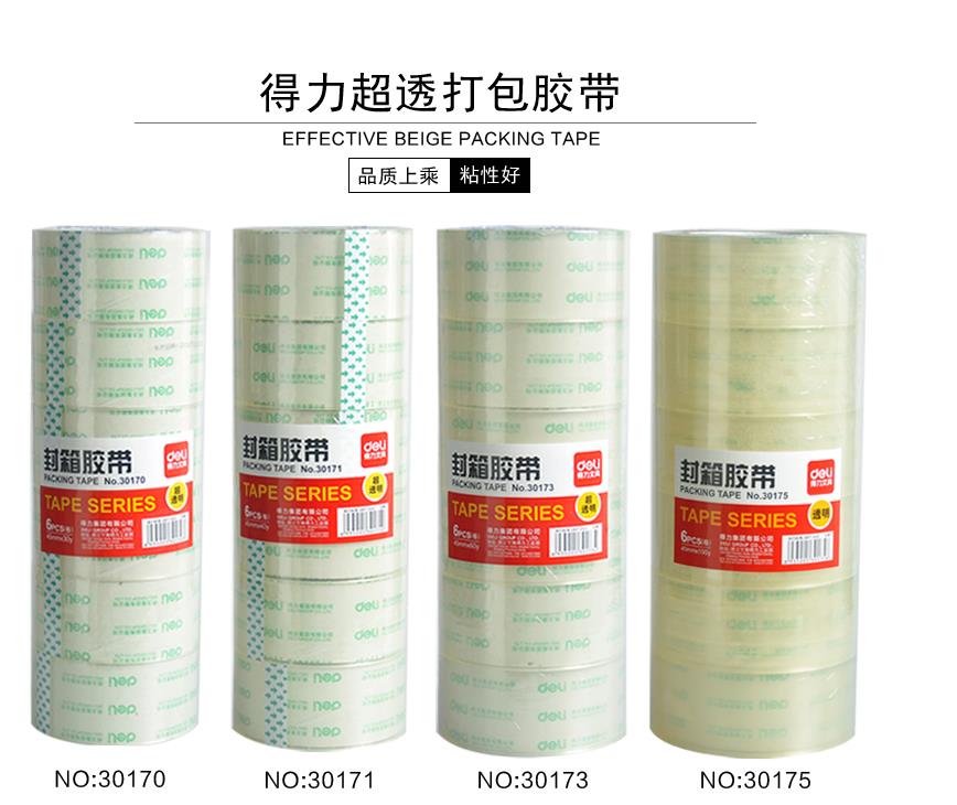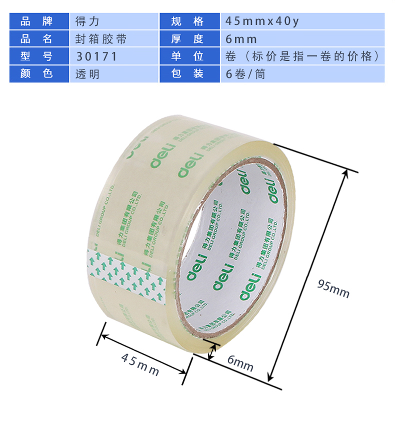 商品名称:得力30171,封箱胶带45*50Y(爆款一口价),宽胶带45*50 商品编号:12.09.01.0171 品牌:文具/LZN 上架时间:2014-09-23 商品毛重:0克 宽度:45mm 长度:50码 包装:1/6/120 起订量:筒 如果您发现商品信息不准确,欢迎纠错;如果您发现有比51文具价格更低的,欢迎举报