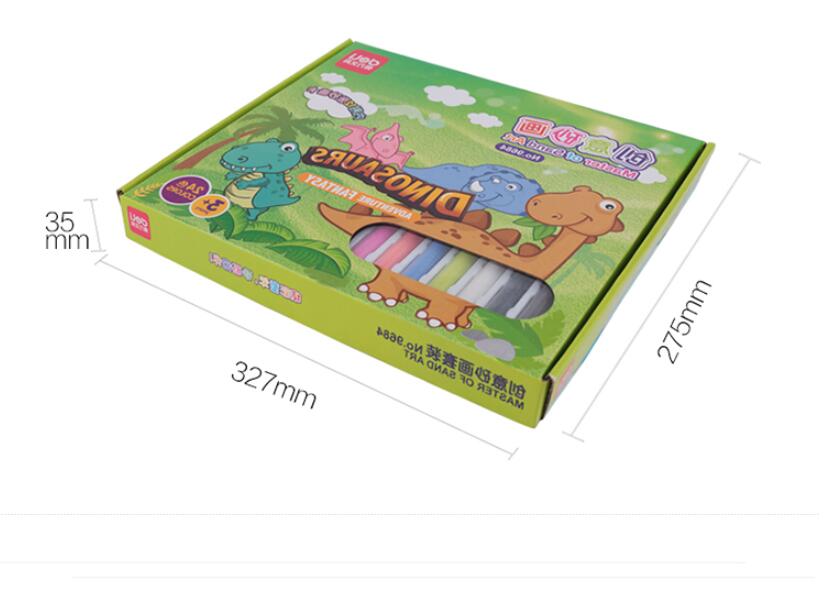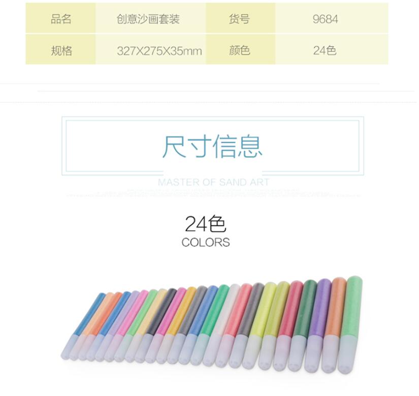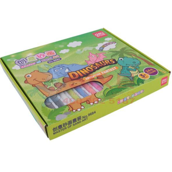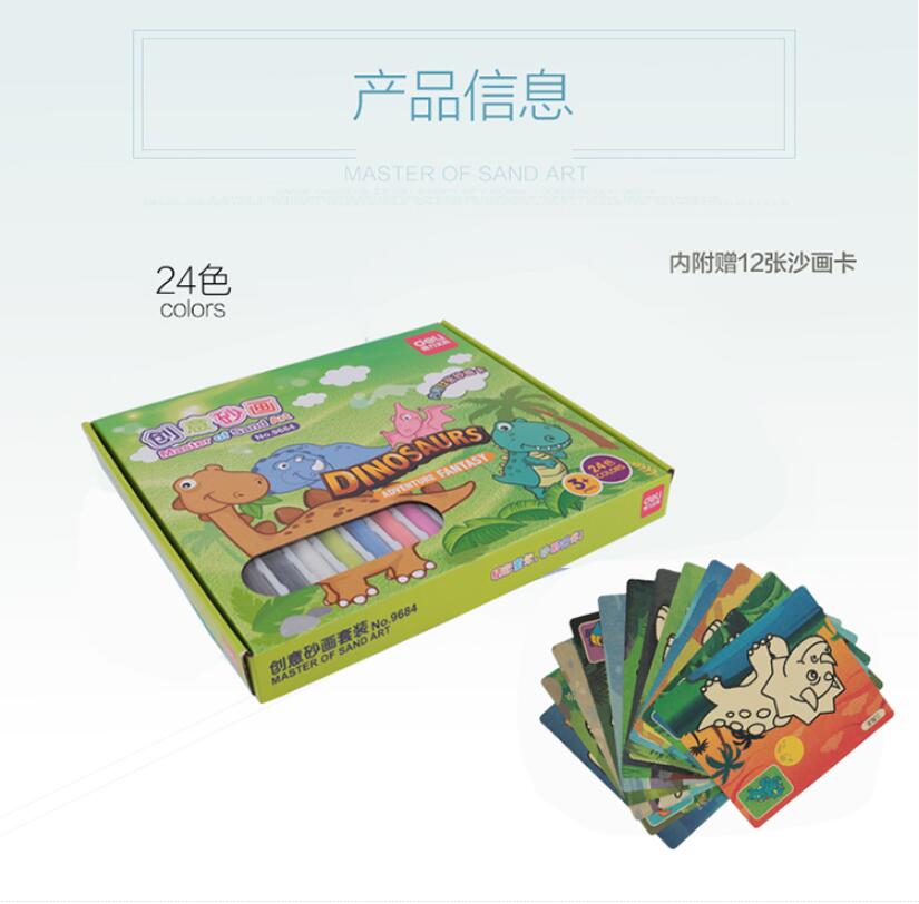 商品名称:得力9684,趣味延续砂画(1/24)12色彩沙+12张砂画卡 涂鸦/绘画工具-24色,12张装 商品编号:11.21.01.9684 品牌:得力/deli 上架时间:2017-06-30 商品毛重:0克 颜色数:24色 包装含量:1/24 价格单位:盒 起批量:盒 如果您发现商品信息不准确,欢迎纠错;如果您发现有比51文具价格更低的,欢迎举报