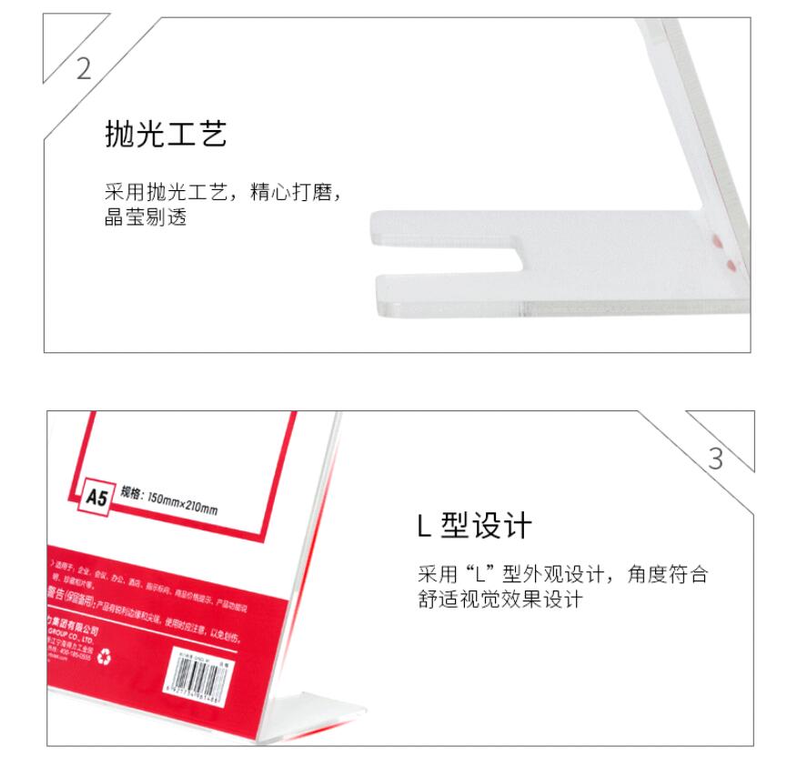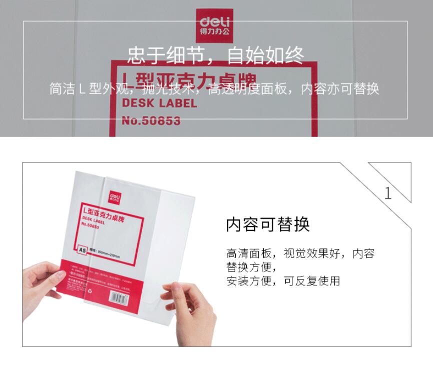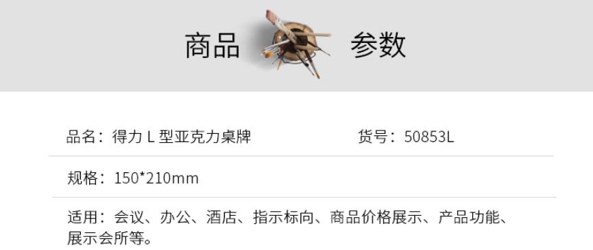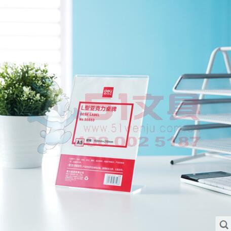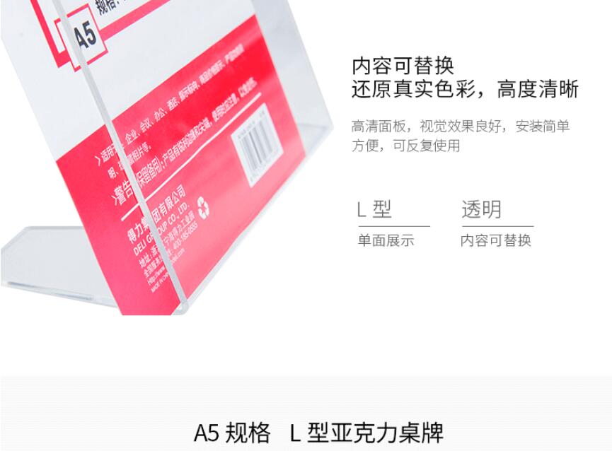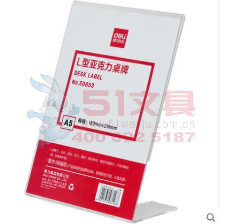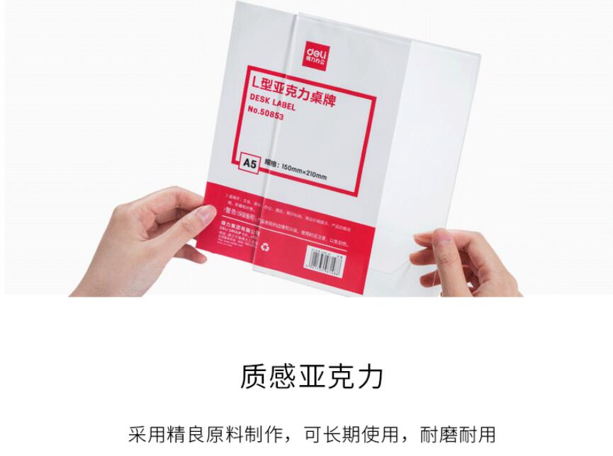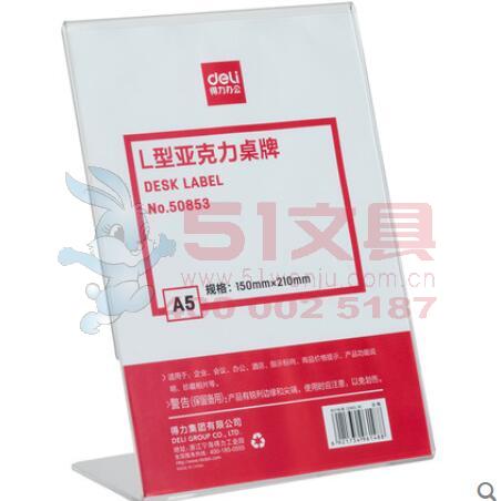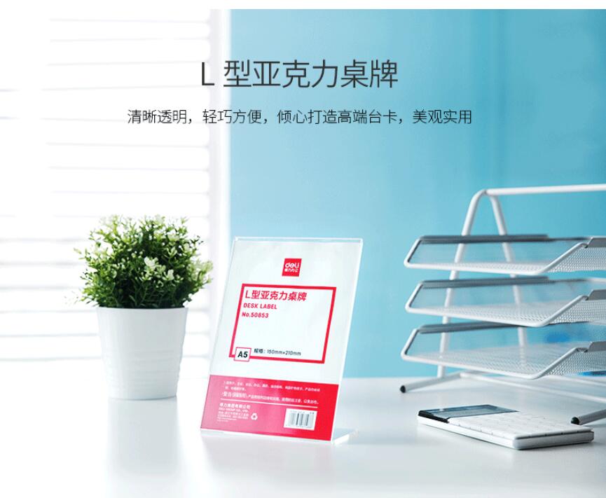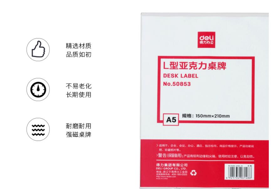 商品名称:得力50853, A5(150*210mm)竖式L型亚克力桌牌/台签/台牌/标价牌/台卡 商品编号:12.01.10.0853 品牌:文具/LZN 上架时间:2017-06-30 商品毛重:0克 规格:A5(150*210mm) 类型:竖式 含量:1/48 如果您发现商品信息不准确,欢迎纠错;如果您发现有比51文具价格更低的,欢迎举报
