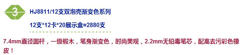 商品名称:小松树8811,双泡壳渐变色学生铅笔,HB铅笔-HJ8811 商品编号:04.01.01.8811 品牌:小松鼠/squirrel 上架时间:2017-07-28 商品毛重:0克 笔杆材质:椴木杆 铅芯规格:2.2mm 类型:HB 是否带橡皮头:带 包装方式:12/144/2880 如果您发现商品信息不准确,欢迎纠错;如果您发现有比51文具价格更低的,欢迎举报
