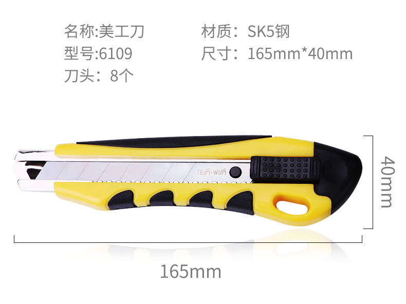 商品名称:天文6109,18mm美工刀(1/12/192)18MM软胶手柄自锁美工刀,切纸刀 商品编号:48.02.04.6109 品牌:天文/TEN-WIN 上架时间:2017-08-01 商品毛重:0克 如果您发现商品信息不准确,欢迎纠错;如果您发现有比51文具价格更低的,欢迎举报