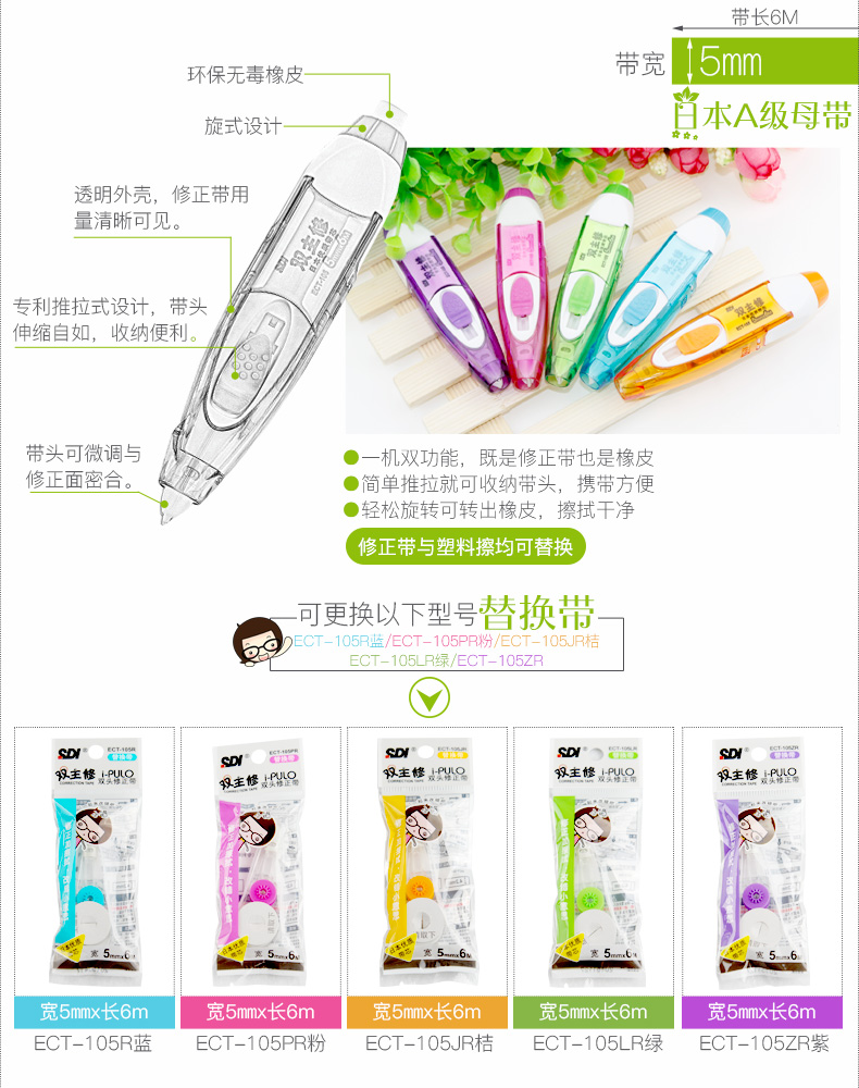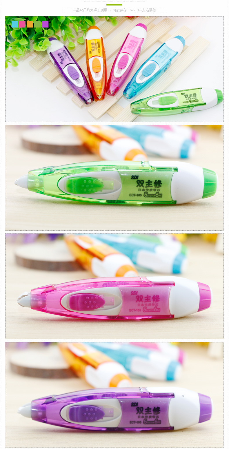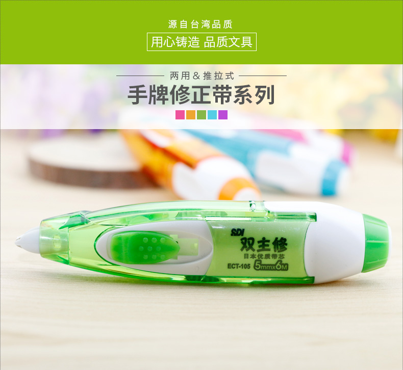 商品名称:台湾SDI手牌 ECT-105 两用修正带/涂改带学生改正带6米可换替芯进口 商品编号:59.01.07.0105 品牌:手牌/SDI 上架时间:2017-08-04 商品毛重:0克 如果您发现商品信息不准确,欢迎纠错;如果您发现有比51文具价格更低的,欢迎举报