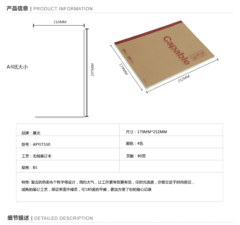 商品名称:晨光笔记本,B580张160页牛卡无线装订本,B5160型办公笔记本/牛皮软抄本(APYJT550) 商品编号:61.04.01.0550T 品牌:晨光/M&G 上架时间:2017-08-06 商品毛重:0克 产品类型:无线装订本 规格:B5 页数:80页 含量:1/8/96 起批量:包(8本) 如果您发现商品信息不准确,欢迎纠错;如果您发现有比51文具价格更低的,欢迎举报