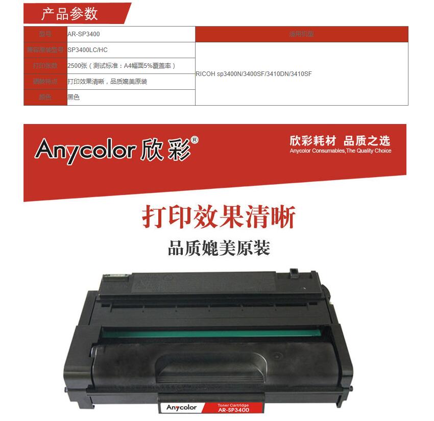 商品名称:欣彩AR-SP3400,黑色硒鼓适用理光SP3400LC/HC ,Ricoh sp3400N/3400SF 黑色 商品编号:ECS007845 品牌:欣彩/Anycolor 上架时间:2017-08-27 商品毛重:0克 如果您发现商品信息不准确,欢迎纠错;如果您发现有比51文具价格更低的,欢迎举报