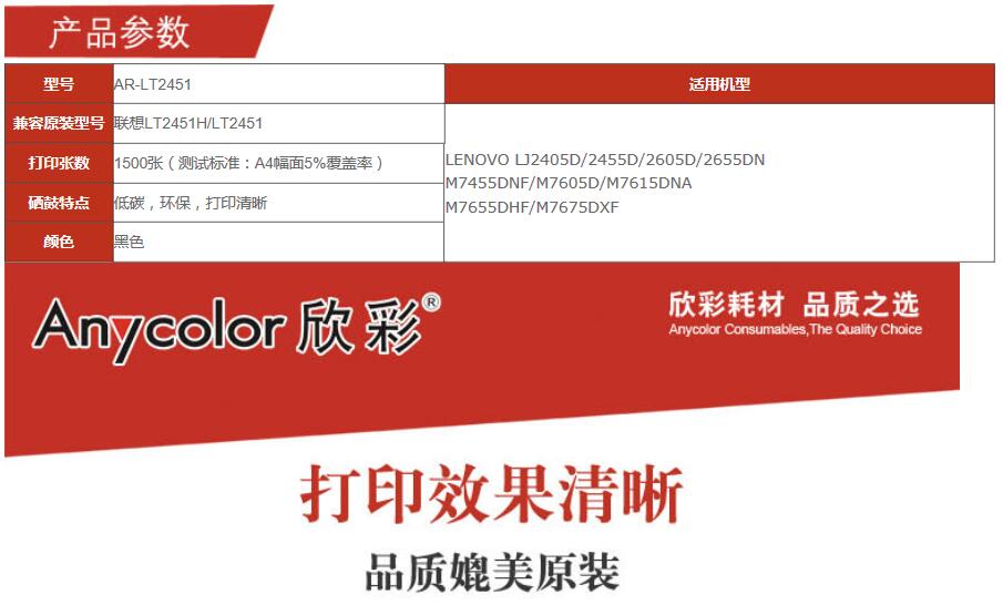 商品名称:欣彩2451,黑色粉盒(LT2451),适用联想LJ2605D/7605/2655/7655/7615/7455/7675DXF 商品编号:ECS007853 品牌:欣彩/Anycolor 上架时间:2017-08-27 商品毛重:0克 如果您发现商品信息不准确,欢迎纠错;如果您发现有比51文具价格更低的,欢迎举报