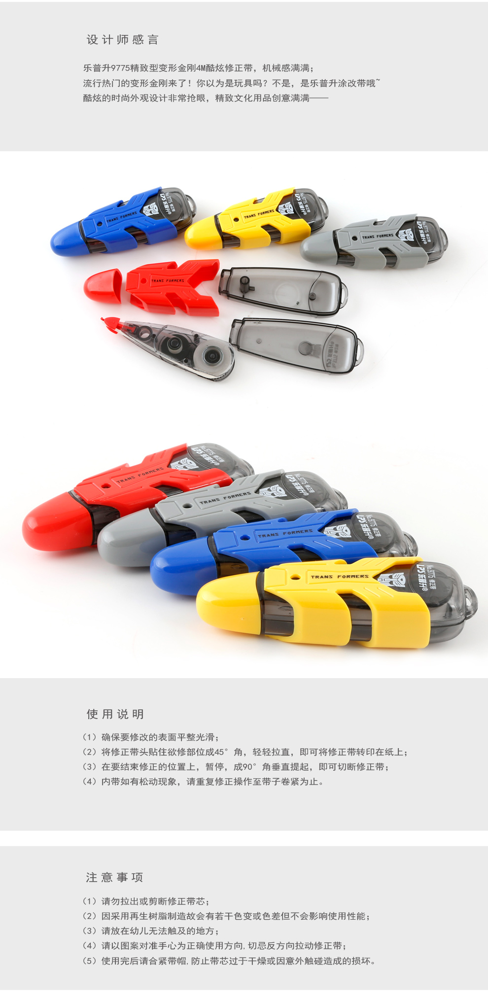 商品名称:乐普升9775, 5mm*4m修正带变形金刚4M学生创意卡通修改带,T-9775 商品编号:68.01.01.9775 品牌:乐普升/LPS 上架时间:2017-11-16 商品毛重:0克 规格:5mm*4m 含量:1/24/576 如果您发现商品信息不准确,欢迎纠错;如果您发现有比51文具价格更低的,欢迎举报