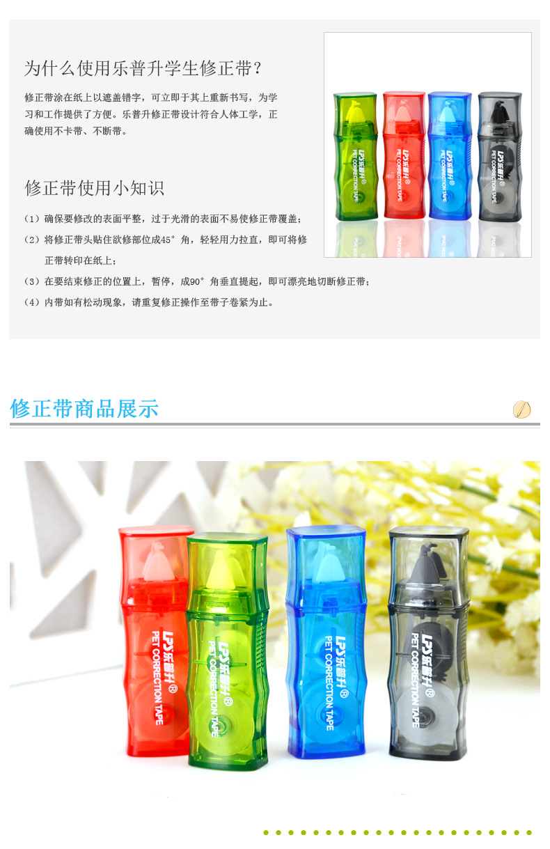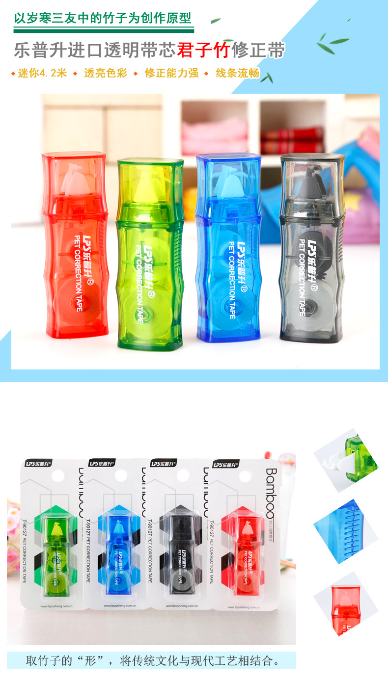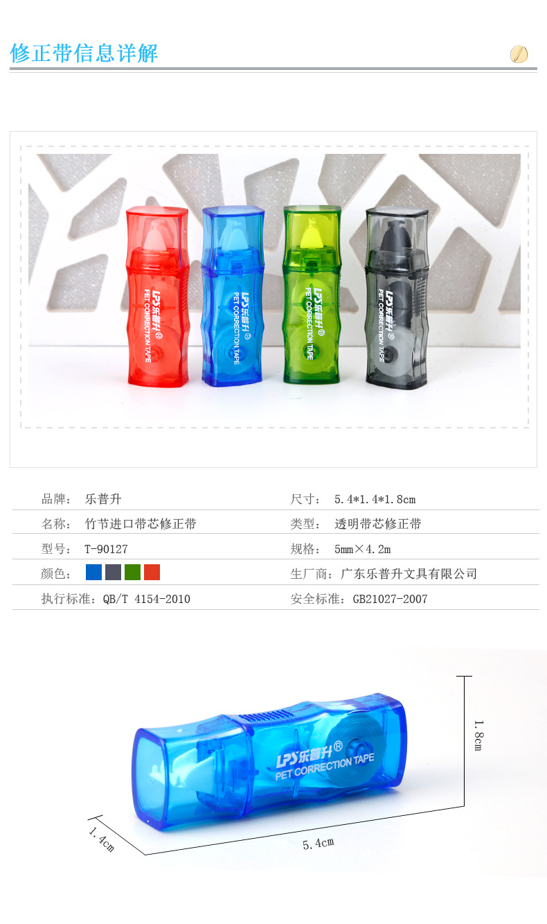商品名称:乐普升90127,5mm*4.2m新品修正带创意透明进品带芯超薄带改正带学生涂改带,T-90127 商品编号:68.01.01.90127 品牌:乐普升/LPS 上架时间:2017-11-16 商品毛重:0克 规格:5mm*4.2m 含量:12/144/576 如果您发现商品信息不准确,欢迎纠错;如果您发现有比51文具价格更低的,欢迎举报