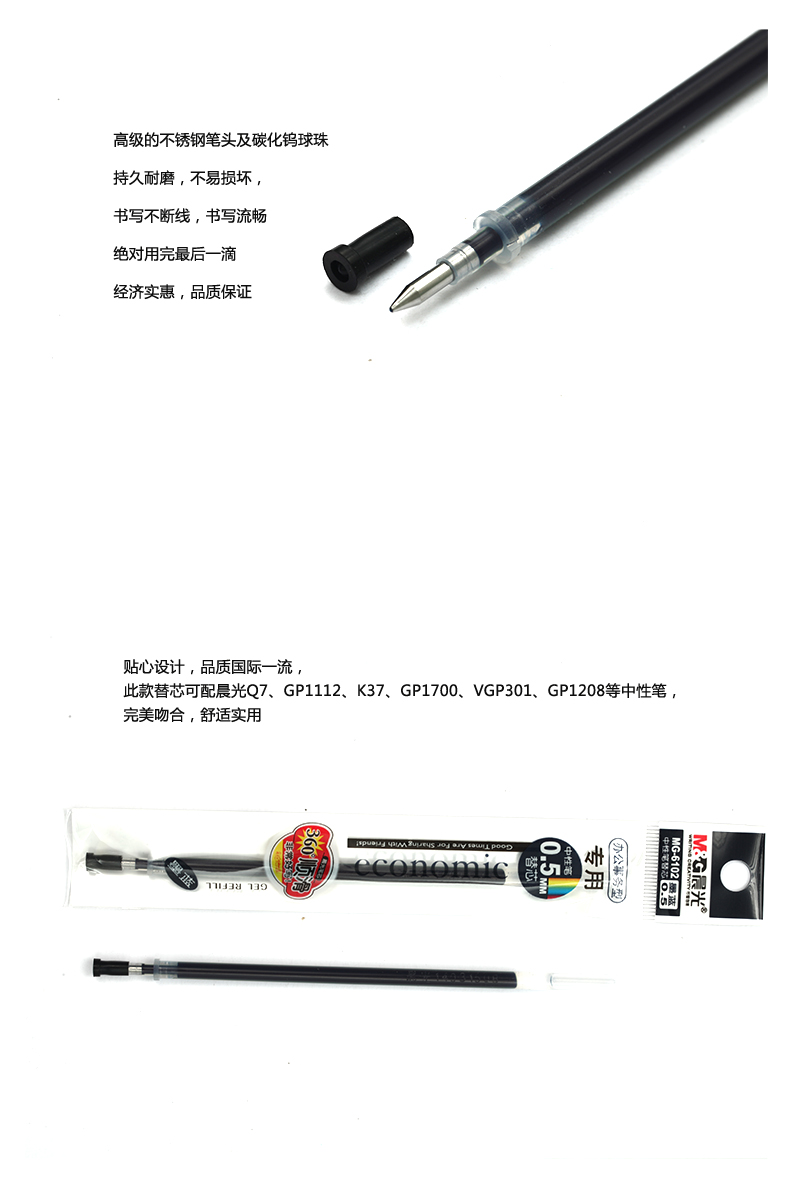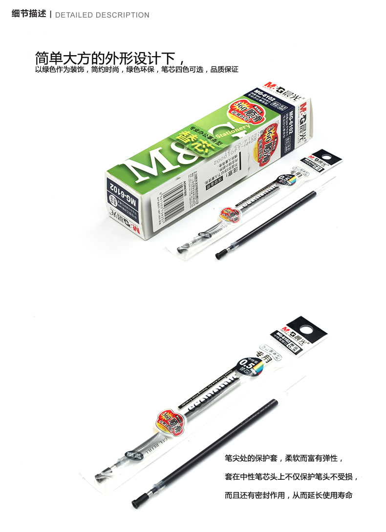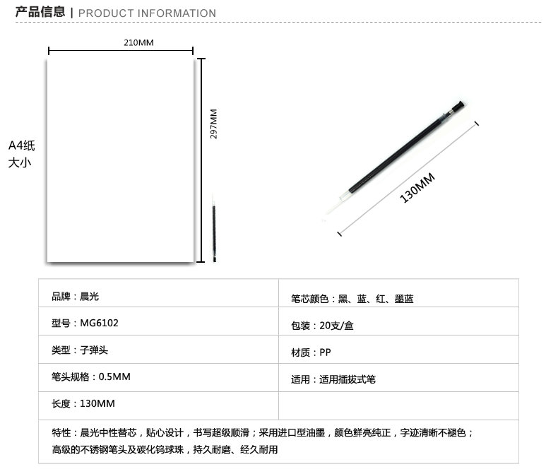 商品名称:晨光MG6102,0.5mm中性笔笔芯/水笔芯/替芯 商品编号:61.03.02.6102 品牌:晨光/M&G 上架时间:2017-11-22 商品毛重:0克 价格单位:支 笔头类型:子弹头 笔头粗细:0.5mm 包装含量:1/20/240/4320 如果您发现商品信息不准确,欢迎纠错;如果您发现有比51文具价格更低的,欢迎举报