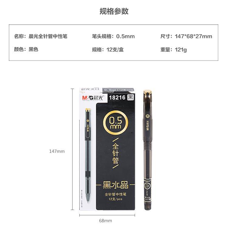 商品名称:晨光18216,0.5mm黑水晶系列全针管/中性笔水笔签字笔 商品编号:61.03.01.18216 品牌:晨光/M&G 上架时间:2017-11-23 商品毛重:0克 价格单位:支 笔头类型:全针管 笔头粗细:0.5mm 包装含量:1/12/144/1728 如果您发现商品信息不准确,欢迎纠错;如果您发现有比51文具价格更低的,欢迎举报