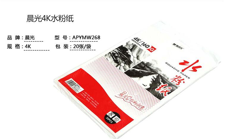 商品名称:晨光APYMW268,4K水粉纸,美术专用 无酸木浆纸 水粉丙烯作画绘画纸,感悟生活水粉纸,4K-20页 商品编号:61.04.11.0268B 品牌:晨光/M&G 上架时间:2017-11-26 商品毛重:0克 标称克重:160g 包装量:1/40 规格:4K 价格单位:包(20张) 如果您发现商品信息不准确,欢迎纠错;如果您发现有比51文具价格更低的,欢迎举报