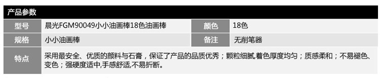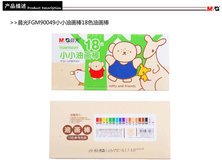 商品名称:晨光FGM90049,18色米菲圆形油画棒 商品编号:61.06.02.90049 品牌:晨光/M&G 上架时间:2017-12-11 商品毛重:0克 颜色数:18色 包装含量:1/12/144 价格单位:盒 如果您发现商品信息不准确,欢迎纠错;如果您发现有比51文具价格更低的,欢迎举报