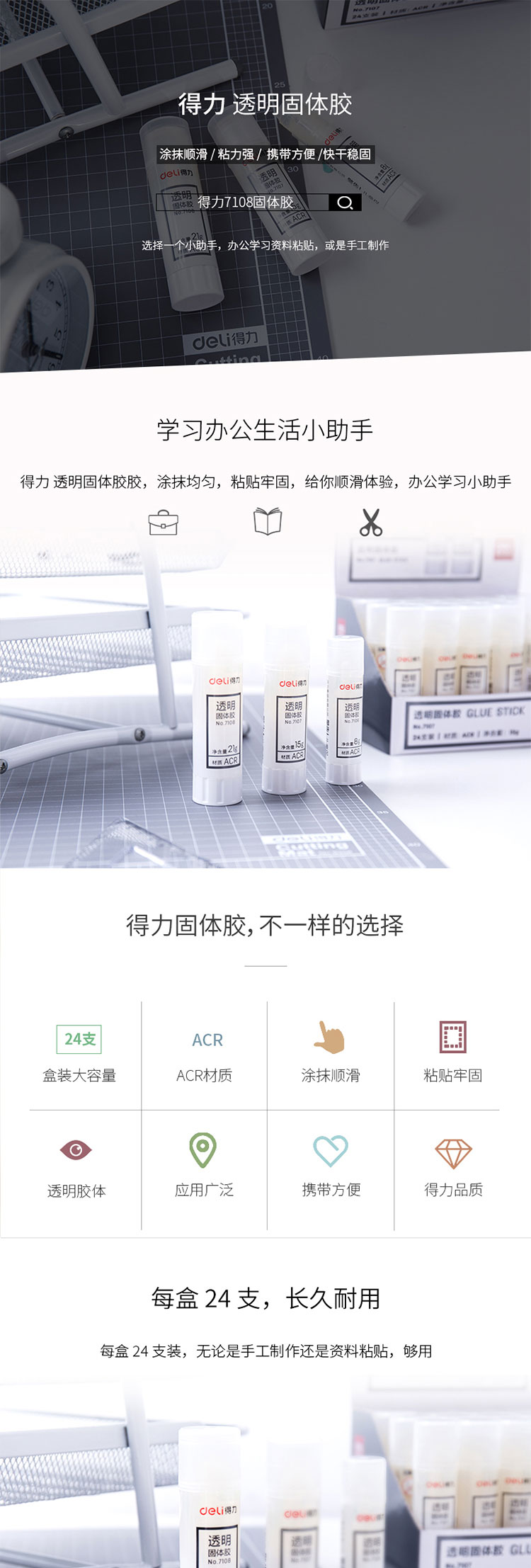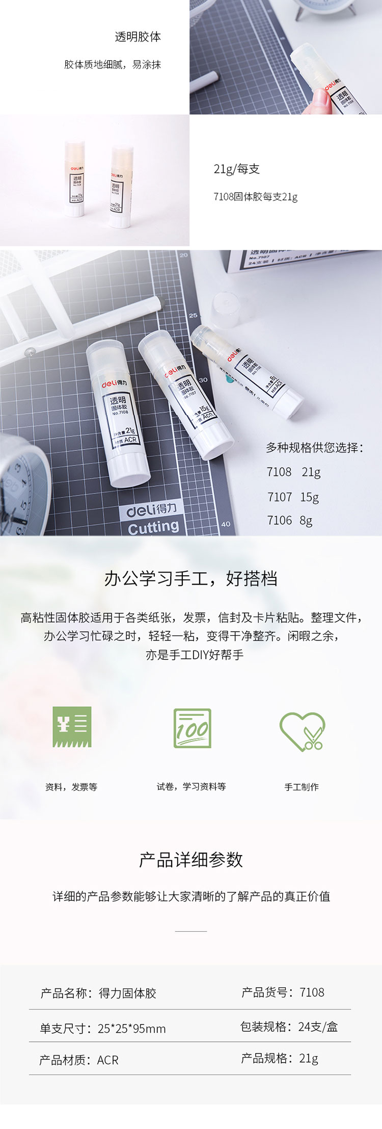 商品名称:得力7108,21g透明固体胶/办公学生财务手工固体胶棒粘度好快干胶棒 商品编号:12.02.17.7108 品牌:文具/LZN 上架时间:2017-12-12 商品毛重:0克 如果您发现商品信息不准确,欢迎纠错;如果您发现有比51文具价格更低的,欢迎举报
