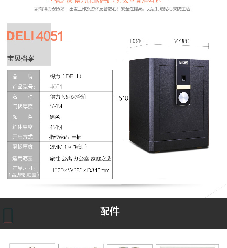 商品名称:得力4051,黑尊指纹保管箱(51*38*34CM),得力黑尊重系列保险柜 商品编号:12.07.72.0451 品牌:文具/LZN 上架时间:2017-12-14 商品毛重:0克 如果您发现商品信息不准确,欢迎纠错;如果您发现有比51文具价格更低的,欢迎举报