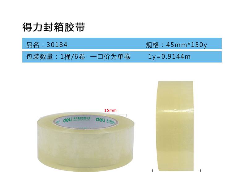 商品名称:得力30184,封箱胶带-45*150y-(爆款一口价)打包胶带 宽胶带 封箱带 商品编号:12.09.01.0184 品牌:文具/LZN 上架时间:2014-09-23 商品毛重:0克 宽度:45mm 长度:150码 包装:1/6/36 起订量:筒 如果您发现商品信息不准确,欢迎纠错;如果您发现有比51文具价格更低的,欢迎举报