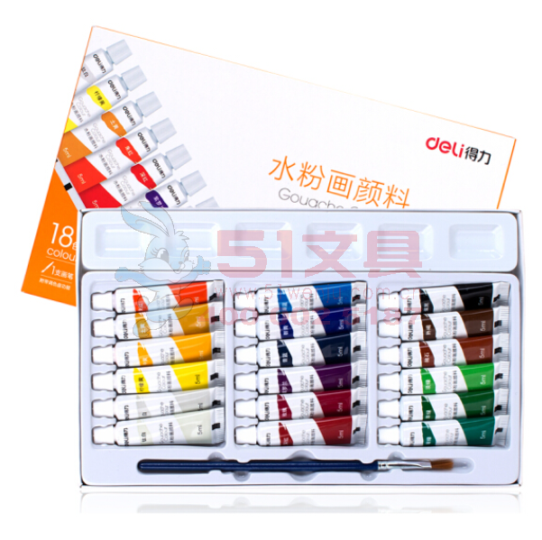 商品名称:得力73863,18色水粉颜料学生水粉画颜料套装/画具画材-送画笔调色盘 商品编号:12.11.44.73863 品牌:得力/deli 上架时间:2017-12-15 商品毛重:0克 颜色数:18色 价格单位:盒 起批量:盒 包装含量:1/12/72 如果您发现商品信息不准确,欢迎纠错;如果您发现有比51文具价格更低的,欢迎举报