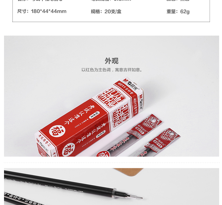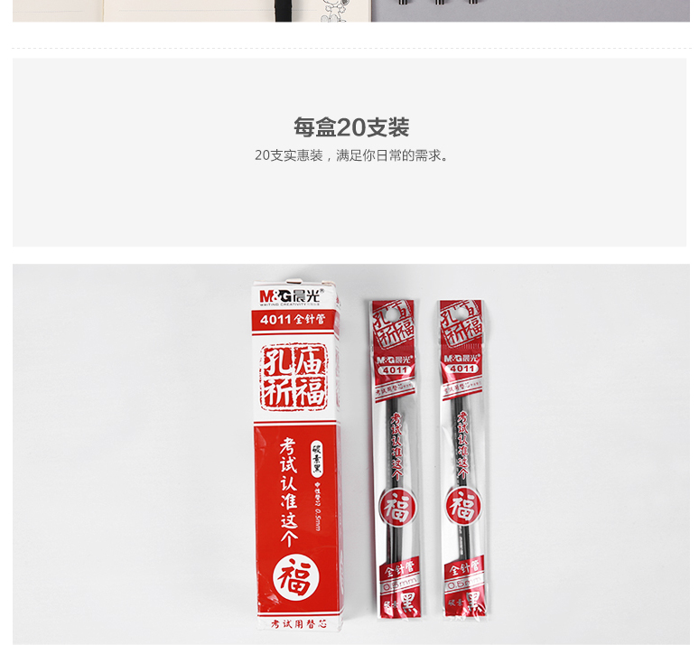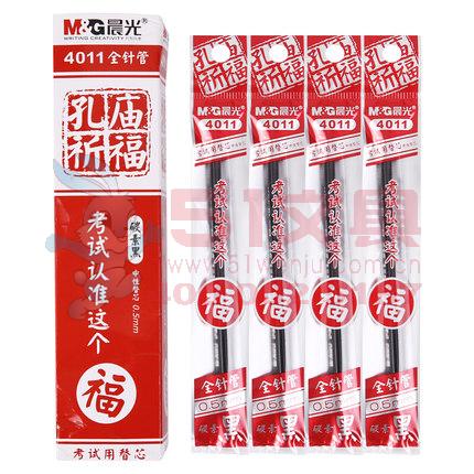 商品名称:晨光4011,孔庙祈福考试笔芯0.5mm,全针管中性签字水笔芯替芯碳素黑 商品编号:61.01.03.4011 品牌:晨光/M&G 上架时间:2018-01-20 商品毛重:0克 价格单位:支 笔头类型:全针管 笔头粗细:0.5mm 包装含量:20/240/4320 如果您发现商品信息不准确,欢迎纠错;如果您发现有比51文具价格更低的,欢迎举报