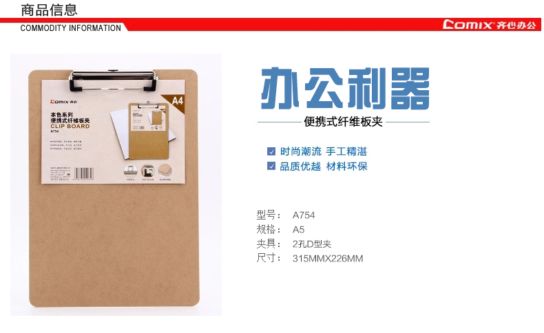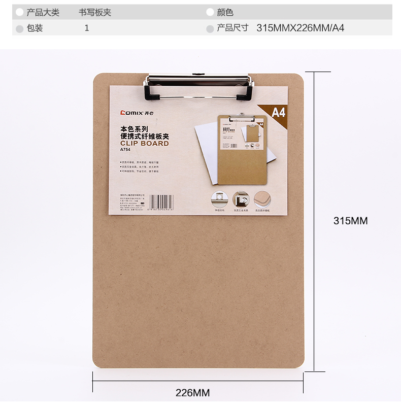 商品名称:齐心A754,本色系列A4 竖式纤维板夹办公文具收纳整理用品 商品编号:13.01.01.0754 品牌:齐心/COMIX 上架时间:2018-03-31 商品毛重:0克 如果您发现商品信息不准确,欢迎纠错;如果您发现有比51文具价格更低的,欢迎举报