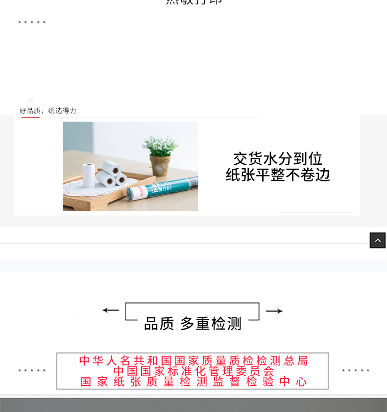商品属性 [材质] 热敏纸 [层数] 单层 [单位] 卷 [幅宽] 57mm [纸张] 65克 [包装方式] 1/4/200 [条码] 6921734921031