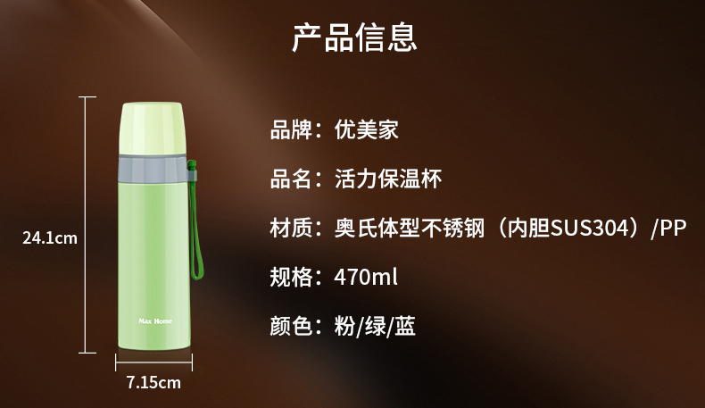 商品名称:优美家8041,糖果色不锈钢真空保温水杯热水壶男女学生儿童户外便携提绳/活力保温杯(470ML)HC8041 商品编号:ECS008819 品牌:品尚美家 上架时间:2018-04-16 商品毛重:0克 如果您发现商品信息不准确,欢迎纠错;如果您发现有比51文具价格更低的,欢迎举报