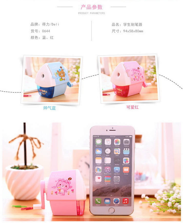 商品名称:得力0644,迷你小屋削笔机,手动削笔器 手摇式卡通房屋卷笔刀 商品编号:12.11.25.0644 品牌:得力/deli 上架时间:2018-04-22 商品毛重:0克 如果您发现商品信息不准确,欢迎纠错;如果您发现有比51文具价格更低的,欢迎举报