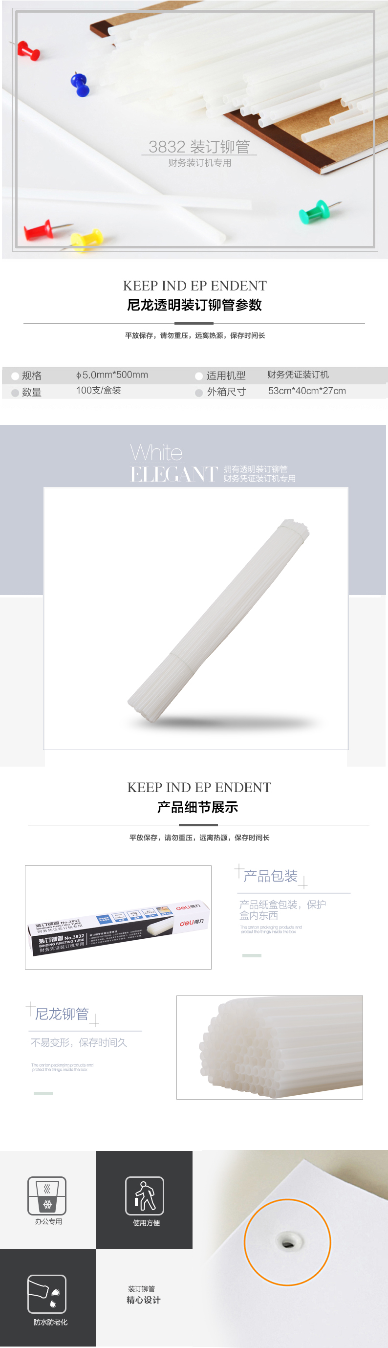 商品名称:得力3832,5.0尼龙透明装订铆管热熔管 3885/3877专用柳管 商品编号:12.07.66.3832 品牌:文具/LZN 上架时间:2018-05-08 商品毛重:0克 如果您发现商品信息不准确,欢迎纠错;如果您发现有比51文具价格更低的,欢迎举报
