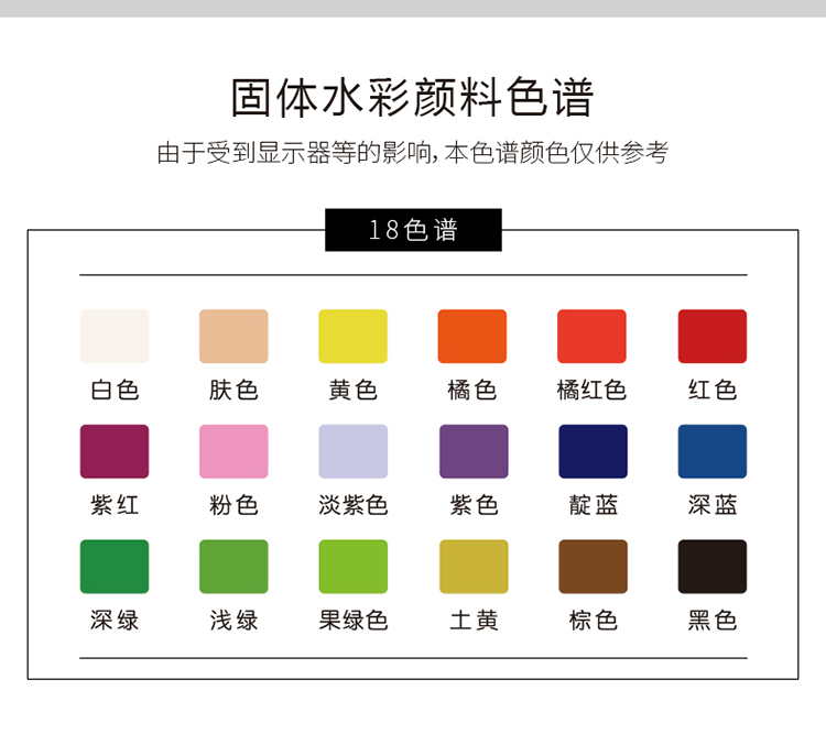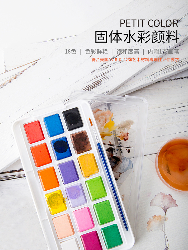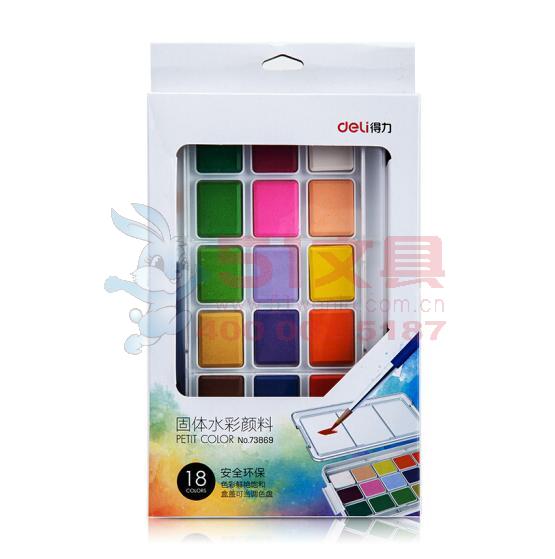 商品名称:得力73869 ,18色固体水彩颜料套装初学者手绘水彩画颜料 商品编号:11.05.03.73869 品牌:得力/deli 上架时间:2018-05-21 商品毛重:0克 颜色数:18色 价格单位:盒 包装含量:1/12/72 如果您发现商品信息不准确,欢迎纠错;如果您发现有比51文具价格更低的,欢迎举报