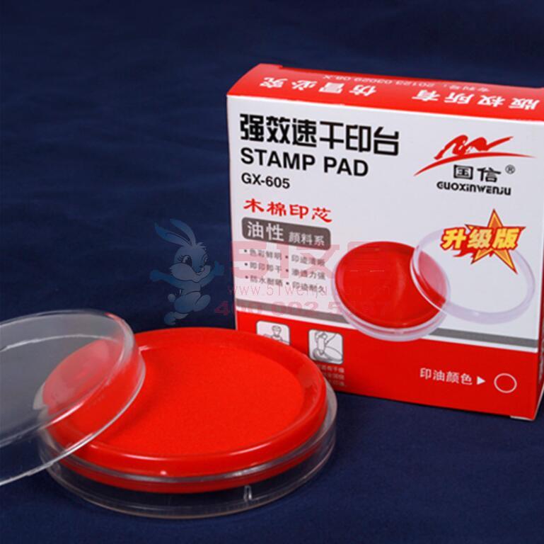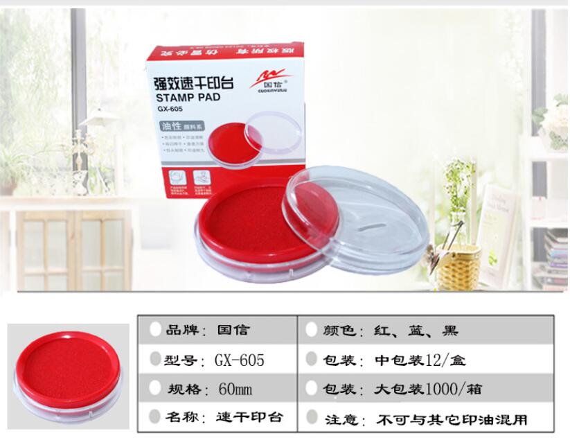商品名称:国信GX605,圆形快干印台(1/12/360)印章财务专用快干红色印台办公盖章按手印印台 商品编号:07.01.01.0605 品牌:八千代 上架时间:2018-05-28 商品毛重:0克 含量:1/12/360 起订量:中包(12PCS) 如果您发现商品信息不准确,欢迎纠错;如果您发现有比51文具价格更低的,欢迎举报
