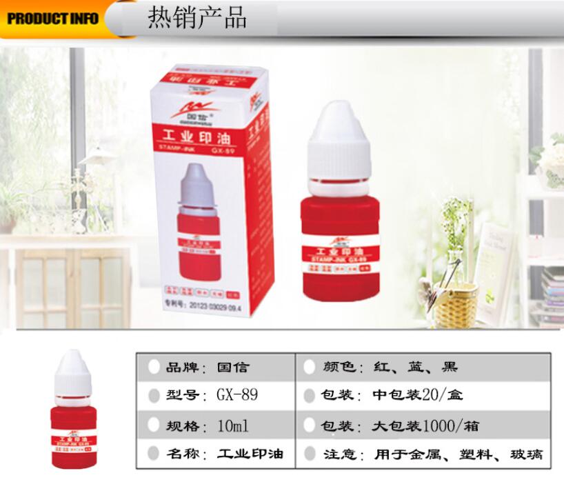 商品名称:国信GX89,10ml工业印油色泽鲜明盖章清晰快干红色 商品编号:07.01.03.0089 品牌:八千代 上架时间:2018-06-02 商品毛重:0克 如果您发现商品信息不准确,欢迎纠错;如果您发现有比51文具价格更低的,欢迎举报