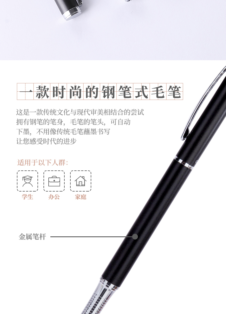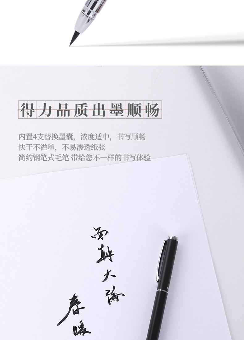 商品名称:得力74294,钢笔式毛笔软笔便携小楷软头新钢笔书法笔 商品编号:11.03.21.74294 品牌:得力/deli 上架时间:2018-06-02 商品毛重:0克 价格单位:卡 包装规格:1/12/144 如果您发现商品信息不准确,欢迎纠错;如果您发现有比51文具价格更低的,欢迎举报