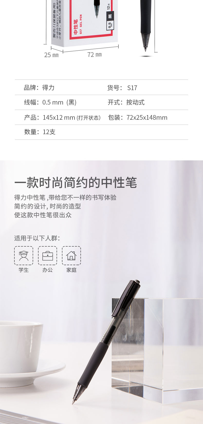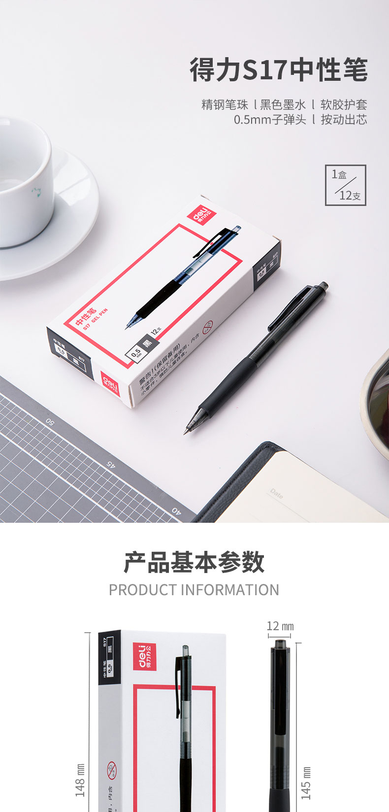 商品名称:得力s17,0.5mm 按动中性笔水笔签字笔进口油墨办公书写笔 商品编号:11.03.01.0017 品牌:得力/deli 上架时间:2018-06-22 商品毛重:0克 价格单位:支 笔头类型:子弹头 笔头粗细:0.5mm 包装含量:12/144/1728 如果您发现商品信息不准确,欢迎纠错;如果您发现有比51文具价格更低的,欢迎举报