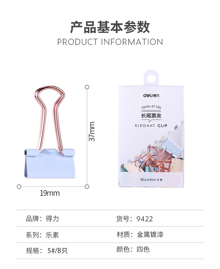 商品名称:得力9422,19mm票夹长尾夹乐素系列喷漆工艺票夹夹子-8只装 商品编号:11.11.02.9422 品牌:得力/deli 上架时间:2018-06-27 商品毛重:0克 如果您发现商品信息不准确,欢迎纠错;如果您发现有比51文具价格更低的,欢迎举报