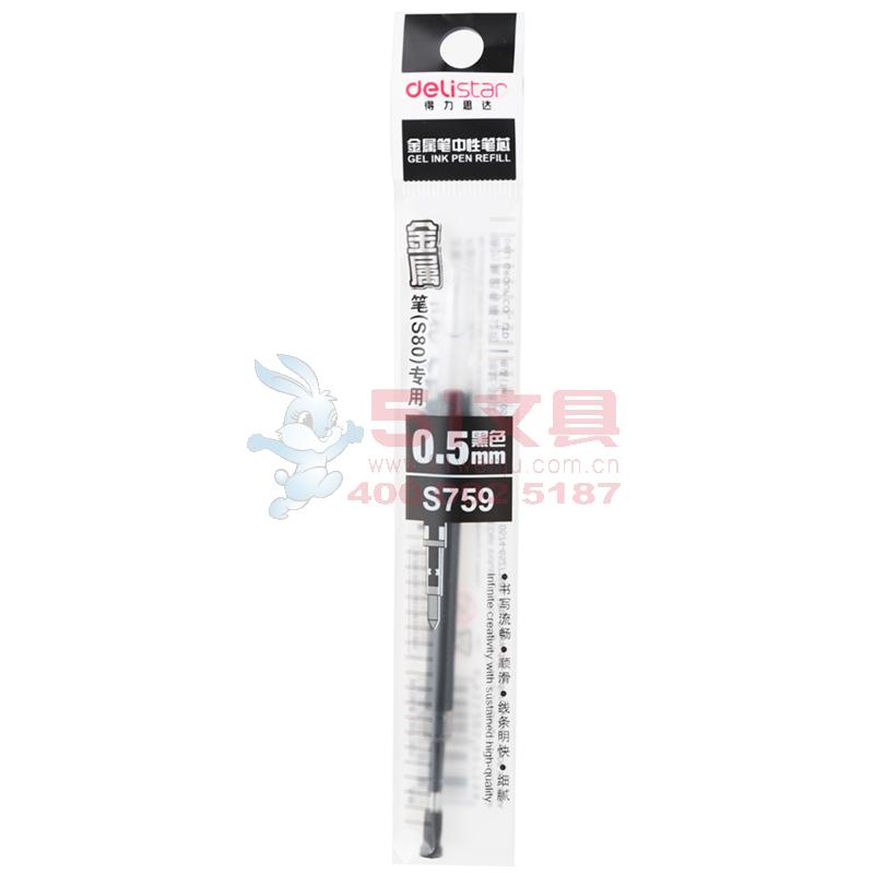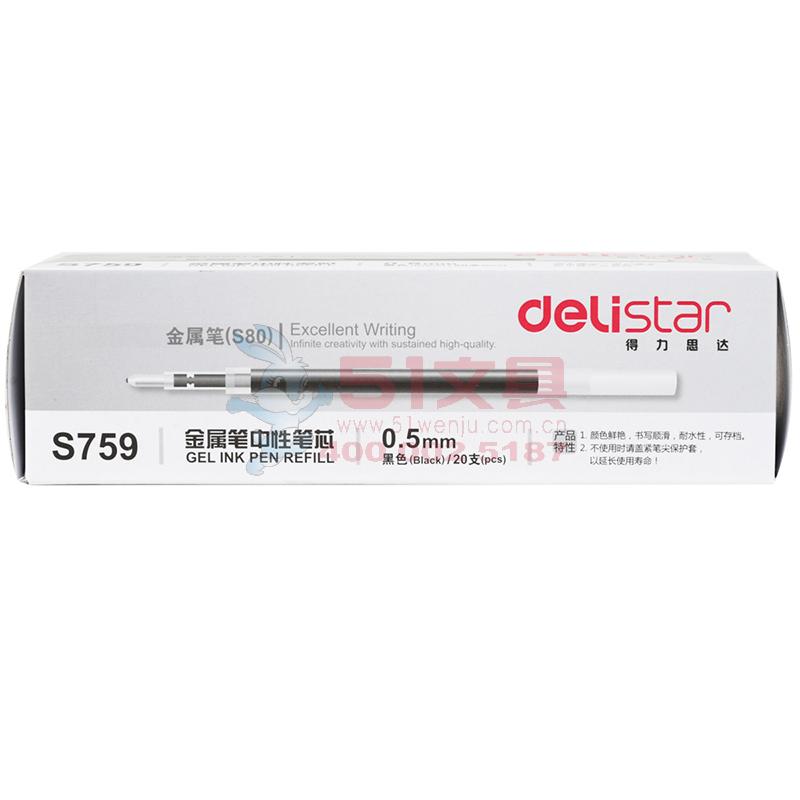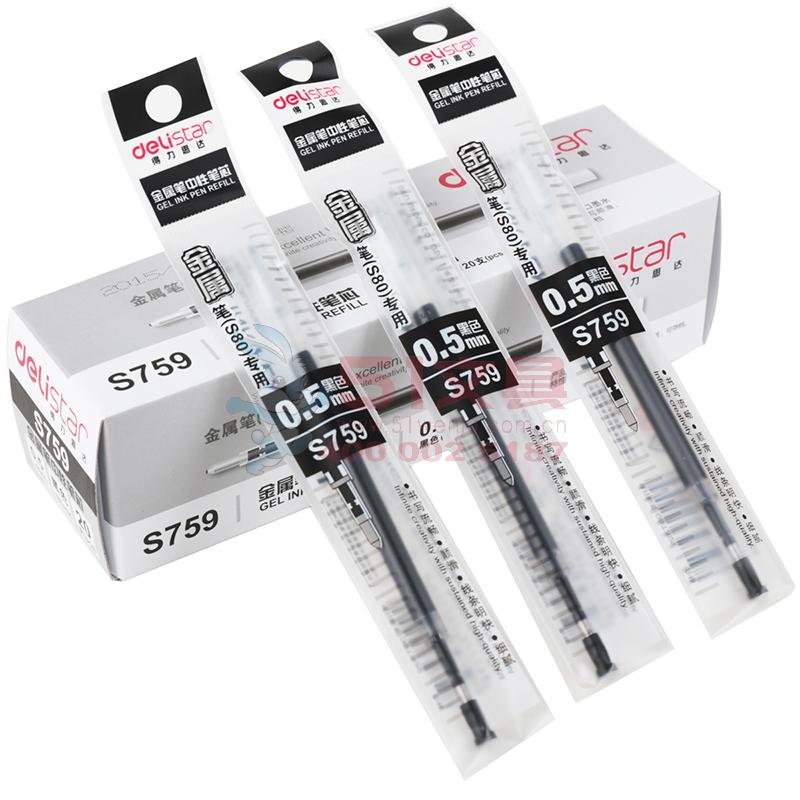 商品名称:得力S759,中性笔芯0.5mm子弹头黑水笔芯S80金属笔专用替芯-20支/盒 商品编号:11.03.09.0759 品牌:得力/deli 上架时间:2018-07-12 商品毛重:0克 价格单位:支 笔头类型:子弹头 笔头粗细:0.5mm 包装含量:20/240/2880 如果您发现商品信息不准确,欢迎纠错;如果您发现有比51文具价格更低的,欢迎举报