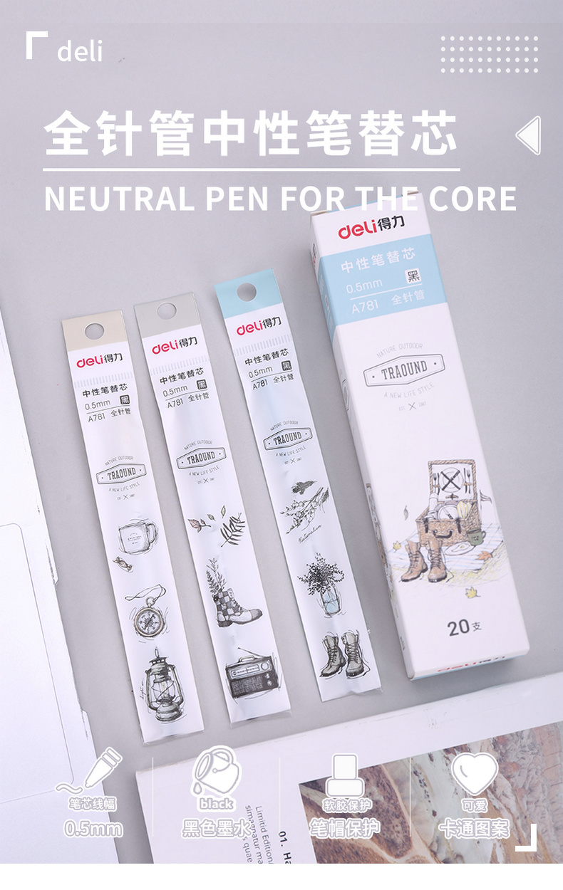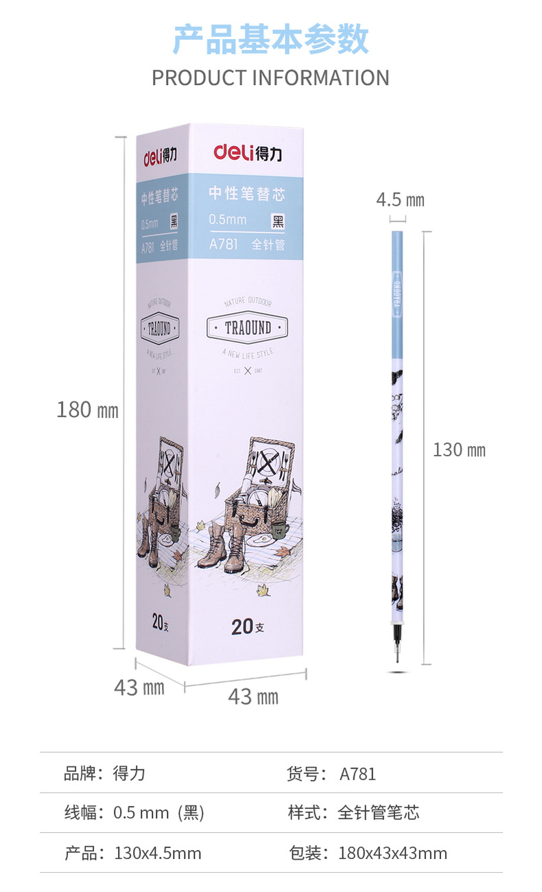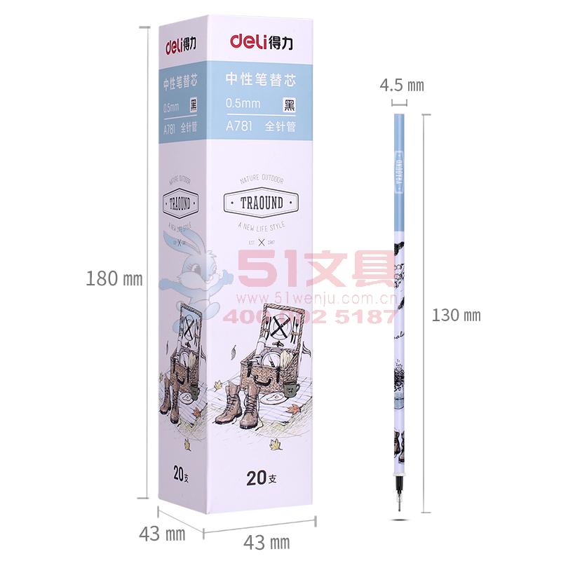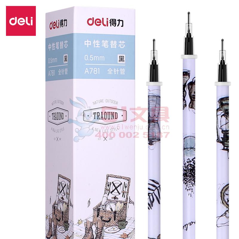 商品名称:得力A781,全针管中性笔芯 0.5mm黑色笔芯替芯水笔芯签字笔芯20支装 商品编号:11.03.09.0781 品牌:得力/deli 上架时间:2018-07-12 商品毛重:0克 价格单位:支 笔头类型:全针管 笔头粗细:0.5mm 包装含量:20/240/2880 如果您发现商品信息不准确,欢迎纠错;如果您发现有比51文具价格更低的,欢迎举报
