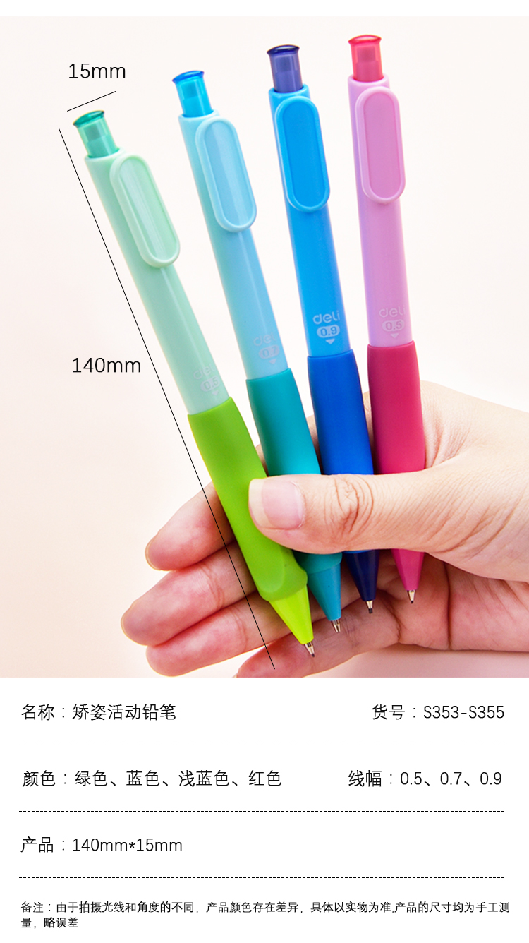 商品名称:得力S353/S354/S355,0.5/0.7/0.9矫姿活动自动铅笔 商品编号:11.03.05.0353 品牌:得力/deli 上架时间:2018-07-23 商品毛重:0克 价格单位:卡 包装含量:1/24/576 如果您发现商品信息不准确,欢迎纠错;如果您发现有比51文具价格更低的,欢迎举报