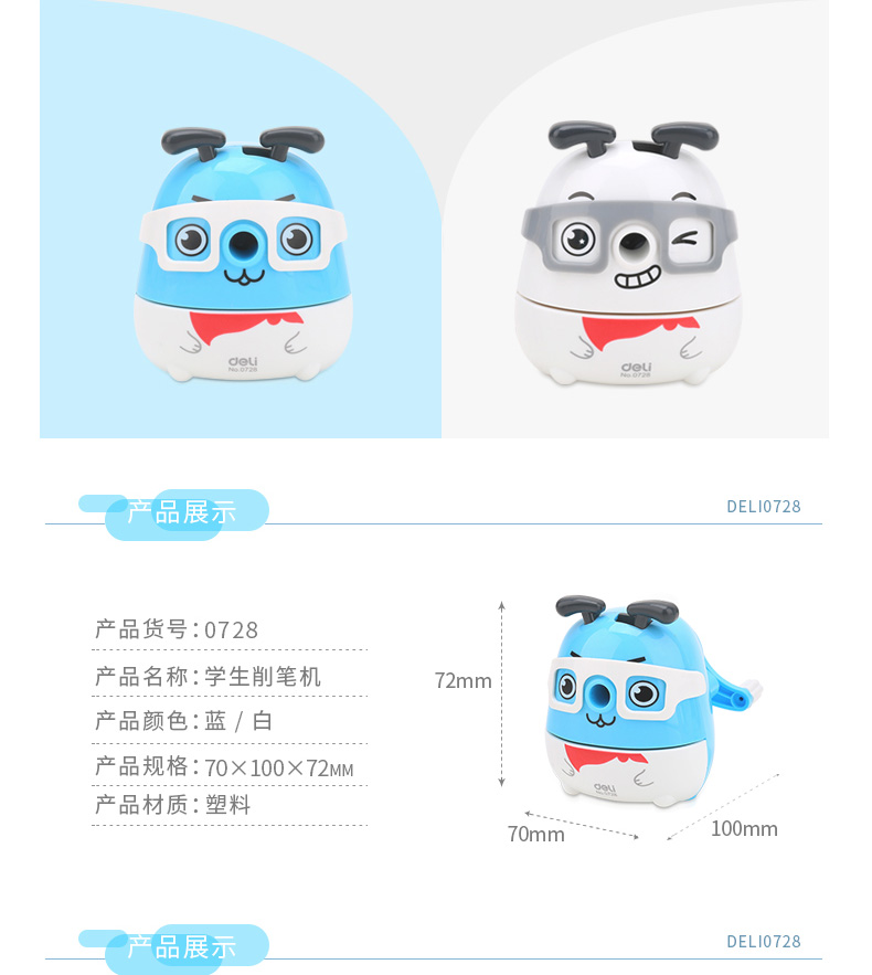 商品名称:得力0728,削笔机 眼睛侠萌萌哒手摇转笔刀 卡通卷笔刀削笔器铅笔刨 商品编号:11.11.12.0728 品牌:得力/deli 上架时间:2018-08-08 商品毛重:0克 如果您发现商品信息不准确,欢迎纠错;如果您发现有比51文具价格更低的,欢迎举报