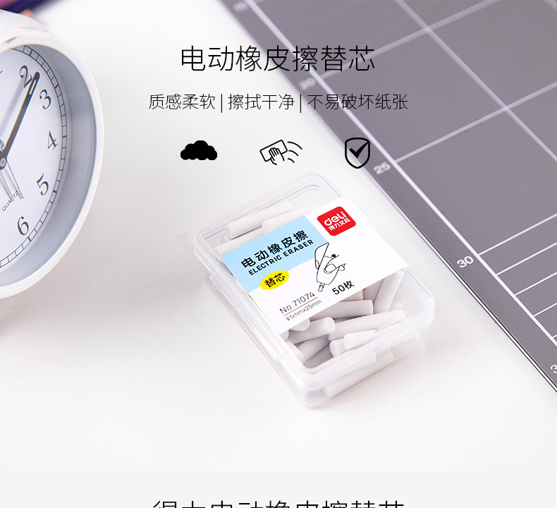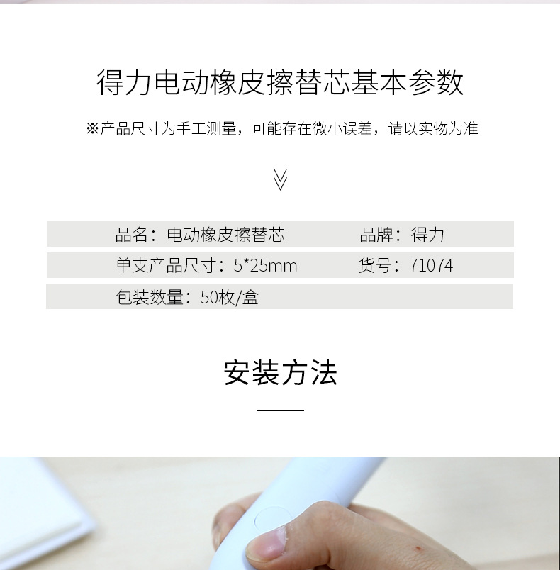 商品名称:得力71074,电动橡皮擦替芯(1/24/288)学生擦得干净创意学习用品电动像皮擦替芯 商品编号:11.13.01.71074 品牌:得力/deli 上架时间:2018-08-09 商品毛重:0克 如果您发现商品信息不准确,欢迎纠错;如果您发现有比51文具价格更低的,欢迎举报