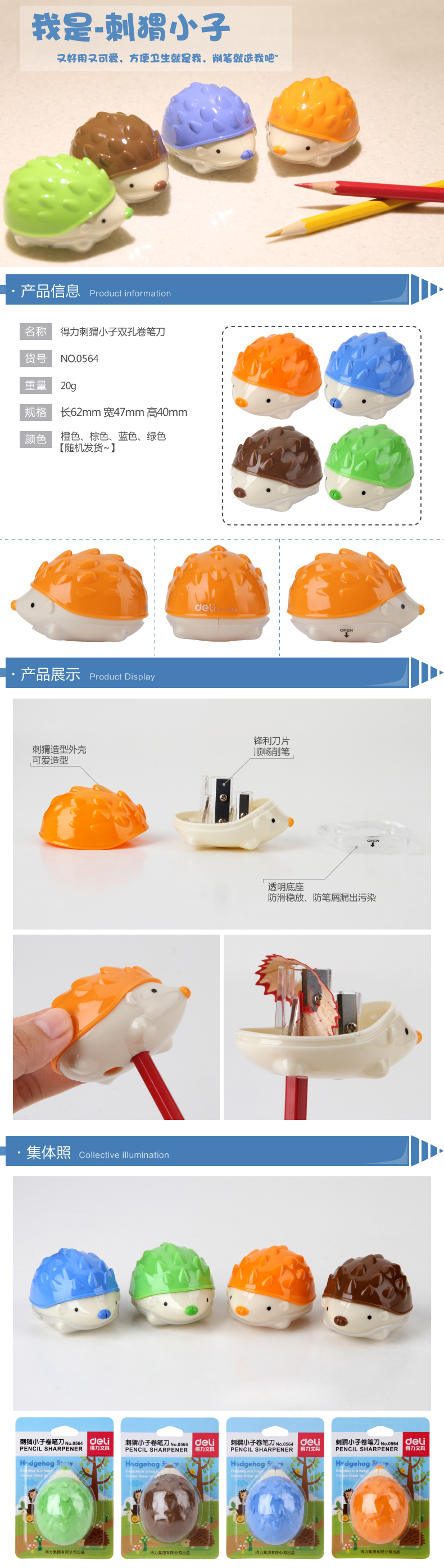 商品名称:得力0564,可爱迷你刺猬卷笔刀(1/12/480)小子卷笔刀学生卡通削笔机双孔削笔器铅笔刀 商品编号:11.11.11.0564 品牌:得力/deli 上架时间:2018-08-11 商品毛重:0克 如果您发现商品信息不准确,欢迎纠错;如果您发现有比51文具价格更低的,欢迎举报