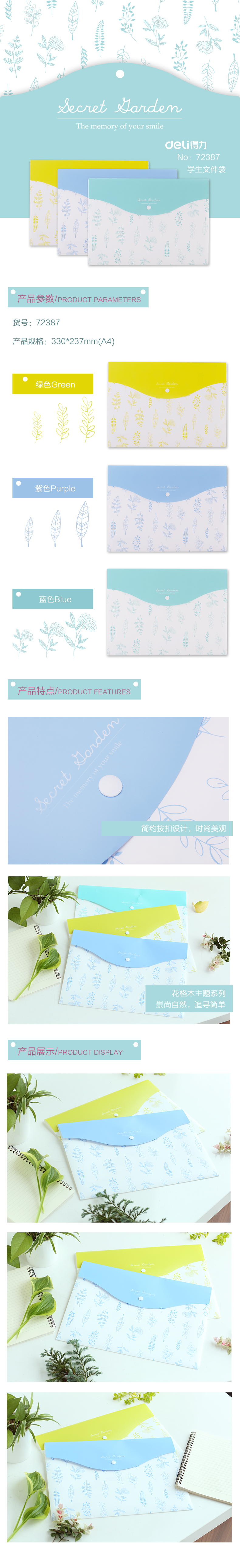 商品名称:得力72387,按扣文件袋 A4纽扣办公档案袋 资料袋 学生考试文件套 商品编号:11.02.04.72387 品牌:得力/deli 上架时间:2018-08-13 商品毛重:0克 规格:A4 含量:1/10/600 如果您发现商品信息不准确,欢迎纠错;如果您发现有比51文具价格更低的,欢迎举报