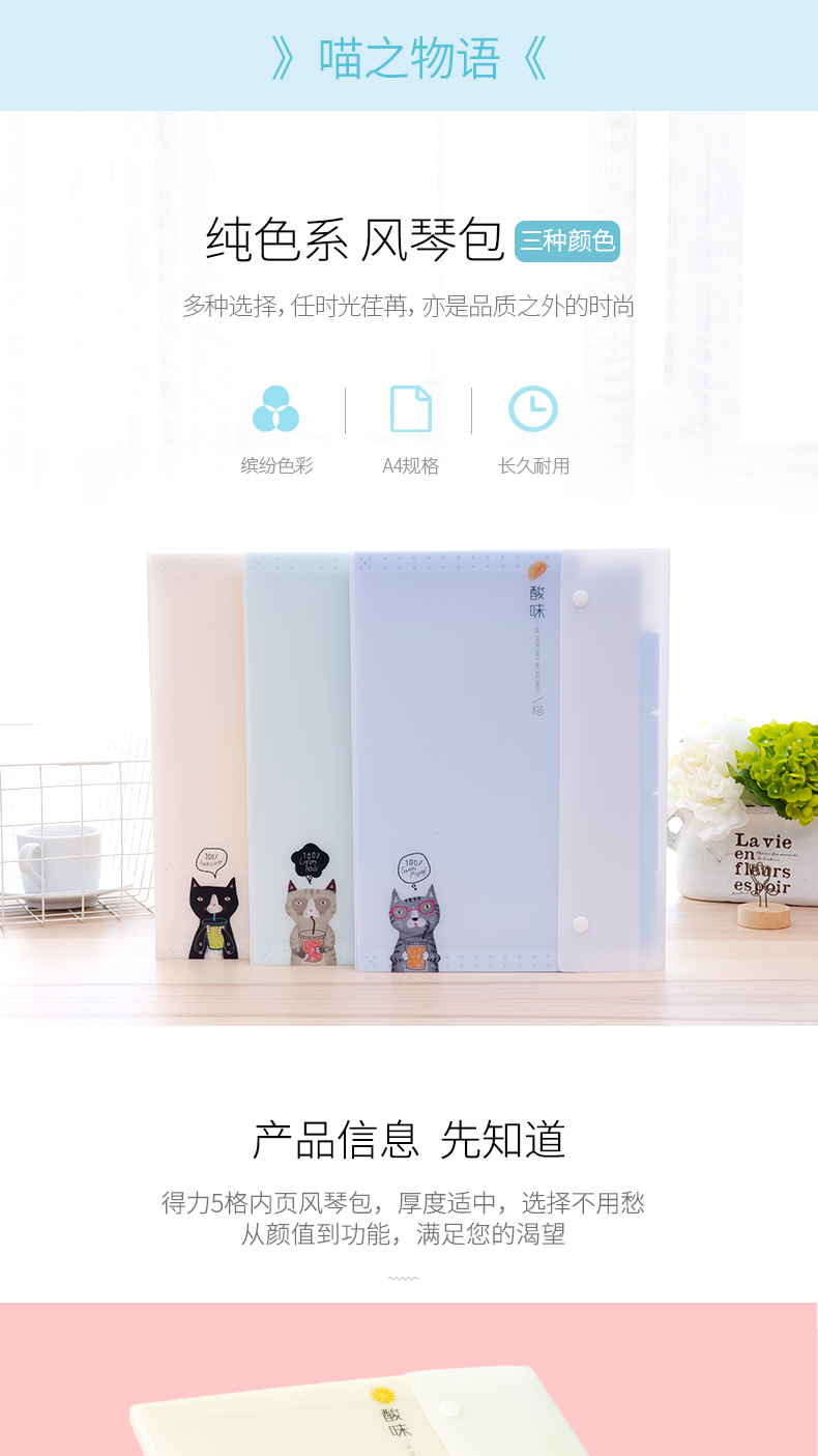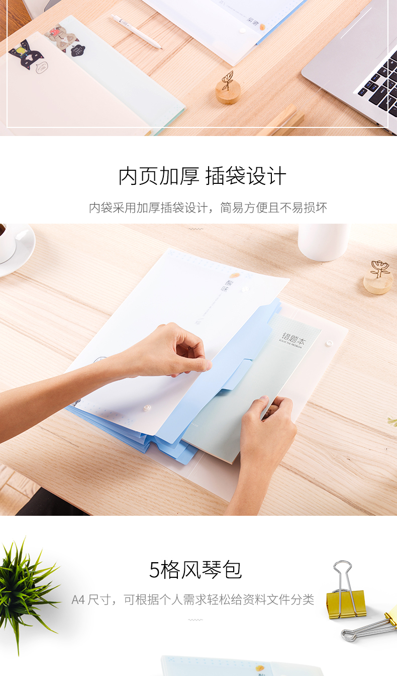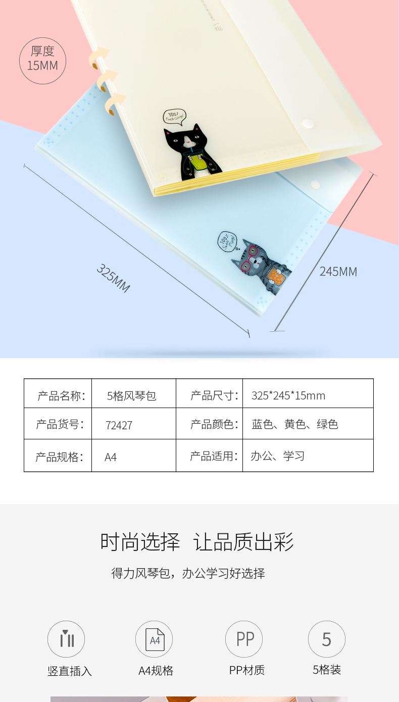商品名称:得力72427,多层风琴包A4小清新5格风琴包文件夹学生试卷收纳包 商品编号:11.02.05.72427 品牌:得力/deli 上架时间:2018-08-14 商品毛重:0克 规格:A4 类型:5格 含量:1/36/72 如果您发现商品信息不准确,欢迎纠错;如果您发现有比51文具价格更低的,欢迎举报