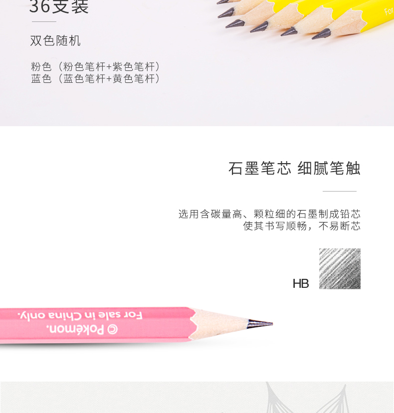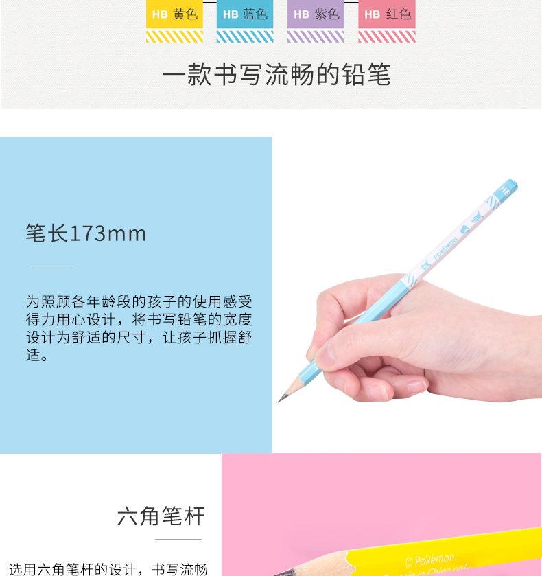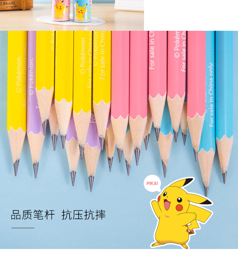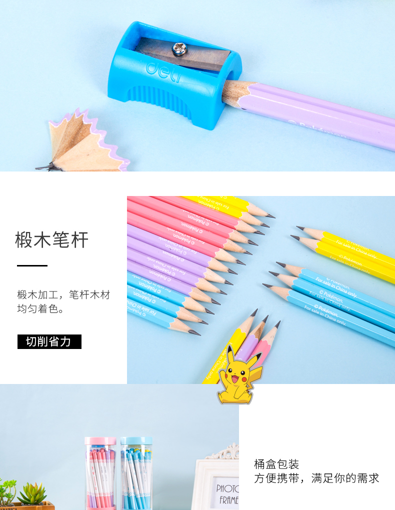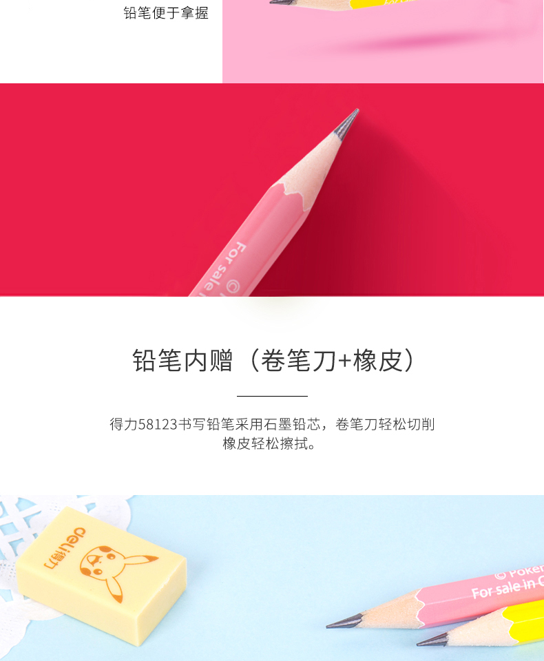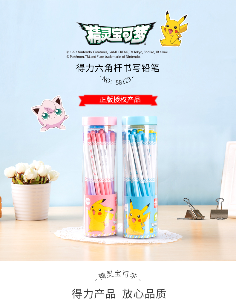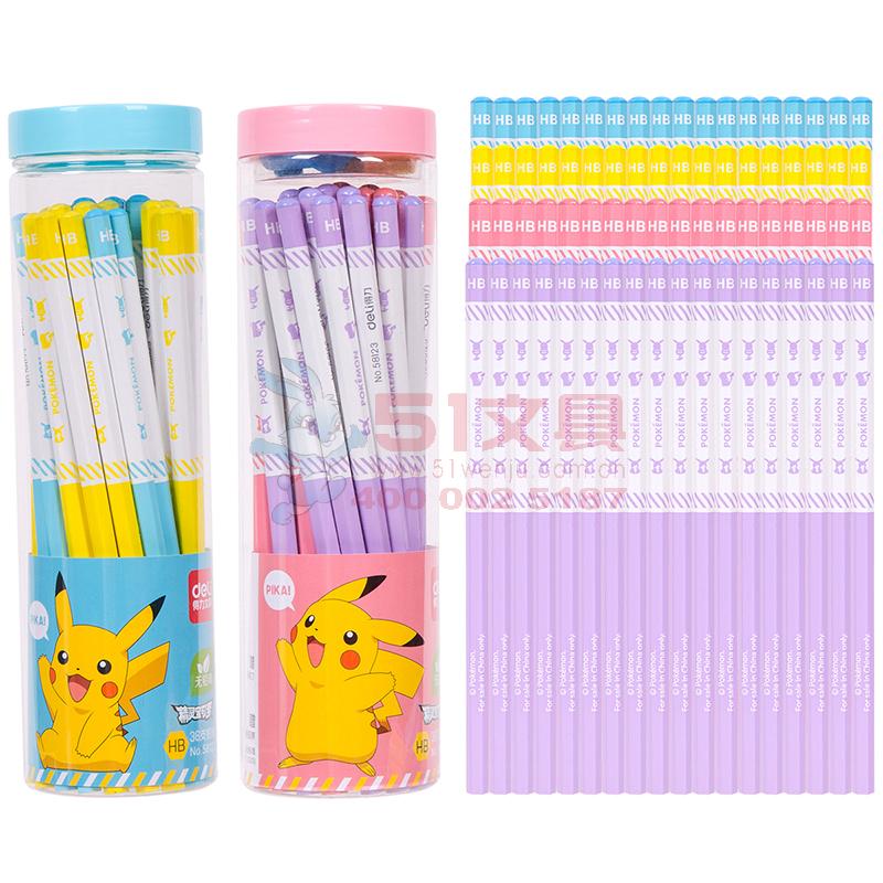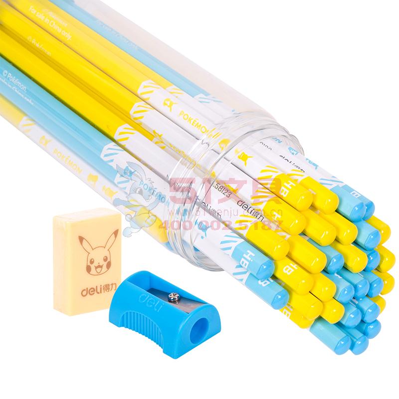 商品名称:得力58123,皮卡丘铅笔六角杆HB桶装小学生考试儿童书写文具-36支装 商品编号:11.03.03.58123 品牌:文海 上架时间:2018-08-17 商品毛重:0克 类型:HB 是否带橡皮头:不带 包装方式:1/12/96 如果您发现商品信息不准确,欢迎纠错;如果您发现有比51文具价格更低的,欢迎举报