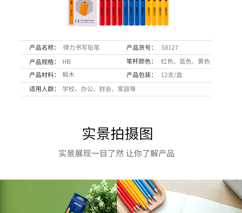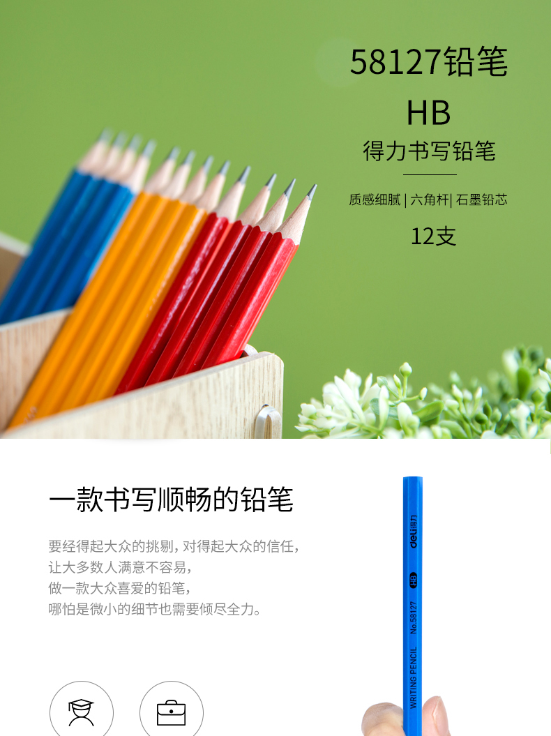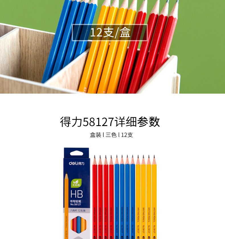 商品名称:得力58127,书写铅笔素描速写美术用铅笔绘图练字初学者画笔HB系列铅笔儿童写字笔椴木制造12支/盒 商品编号:11.03.03.58127 品牌:得力/deli 上架时间:2018-08-18 商品毛重:0克 笔杆材质:椴木杆 类型:HB 是否带橡皮头:不带 包装方式:1/24/288 如果您发现商品信息不准确,欢迎纠错;如果您发现有比51文具价格更低的,欢迎举报