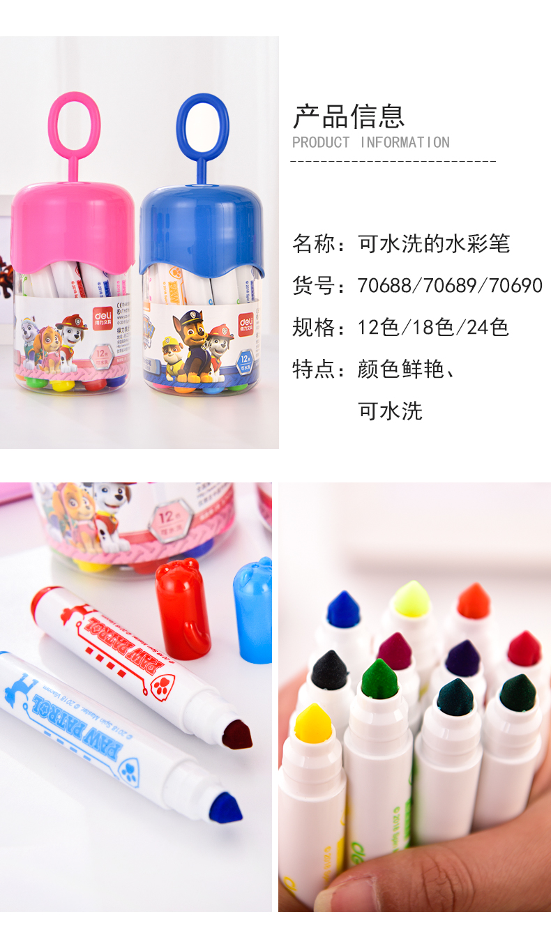 商品名称:得力70688,12色汪汪队立大功可水洗学生水彩笔儿童绘画笔 商品编号:11.05.01.70688 品牌:得力/deli 上架时间:2018-08-31 商品毛重:0克 颜色数:12色 包装含量:1/12/96 如果您发现商品信息不准确,欢迎纠错;如果您发现有比51文具价格更低的,欢迎举报