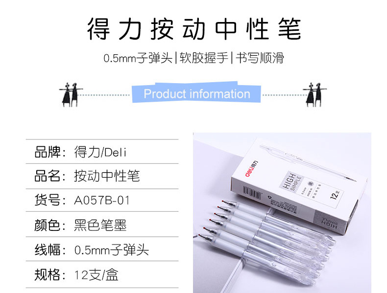 商品名称:得力A057B-01,透明笔杆按动中性笔 黑色水笔0.5mm学习办公签字笔 商品编号:11.03.01.0057 品牌:得力/deli 上架时间:2018-09-11 商品毛重:0克 价格单位:支 笔头类型:全针管 笔头粗细:0.5mm 包装含量:12/144/1728 如果您发现商品信息不准确,欢迎纠错;如果您发现有比51文具价格更低的,欢迎举报 +