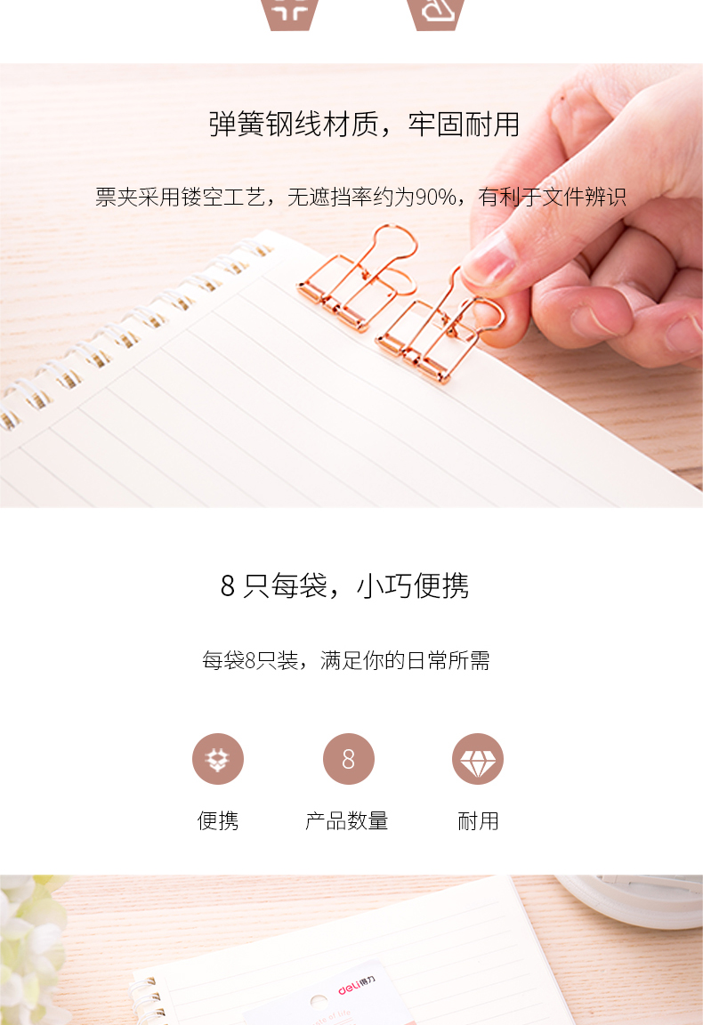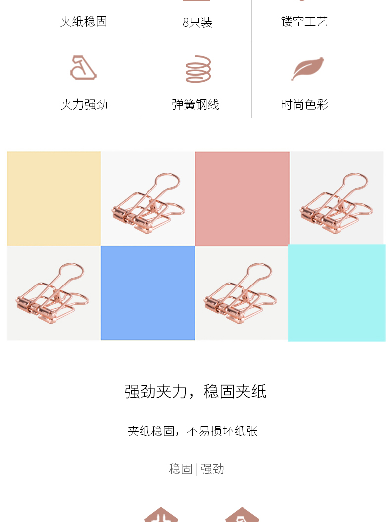 商品名称:得力9414,简约金属镂空创意文具可爱彩色办公文件燕尾夹试卷夹-6只装 商品编号:11.11.02.9414 品牌:得力/deli 上架时间:2018-09-11 商品毛重:0克 如果您发现商品信息不准确,欢迎纠错;如果您发现有比51文具价格更低的,欢迎举报