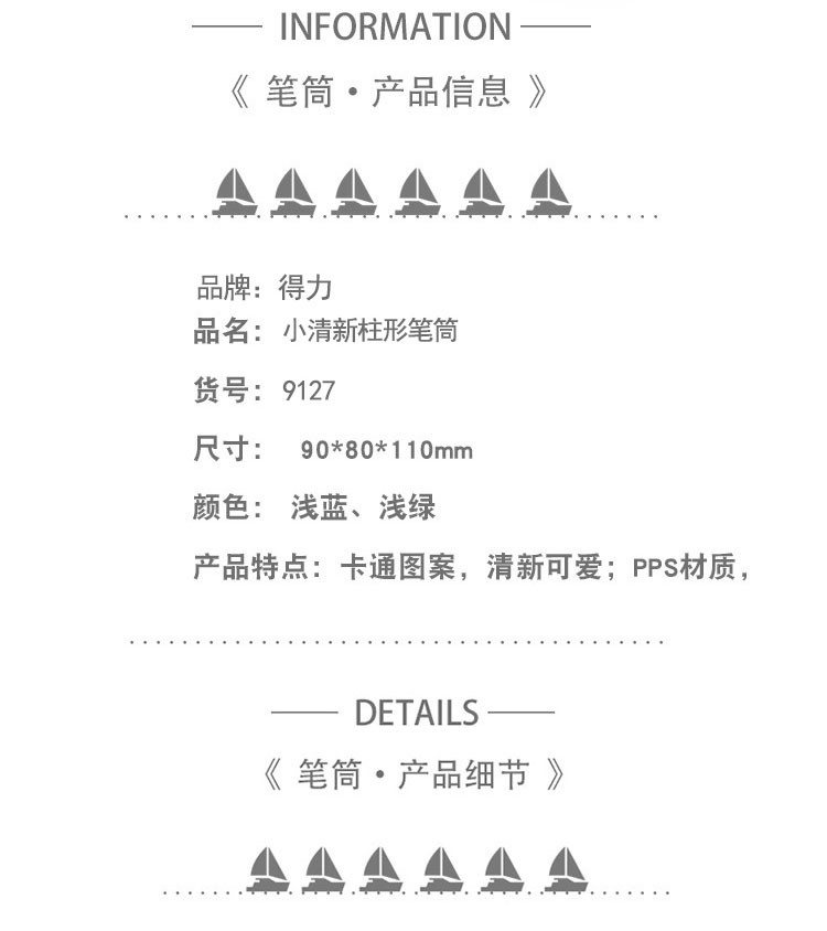 商品名称:得力9127,圆形儿童笔筒 可爱卡通小学生文具收纳笔桶 韩国创意笔筒 商品编号:11.11.21.9127 品牌:得力/deli 上架时间:2018-09-11 商品毛重:0克 如果您发现商品信息不准确,欢迎纠错;如果您发现有比51文具价格更低的,欢迎举报